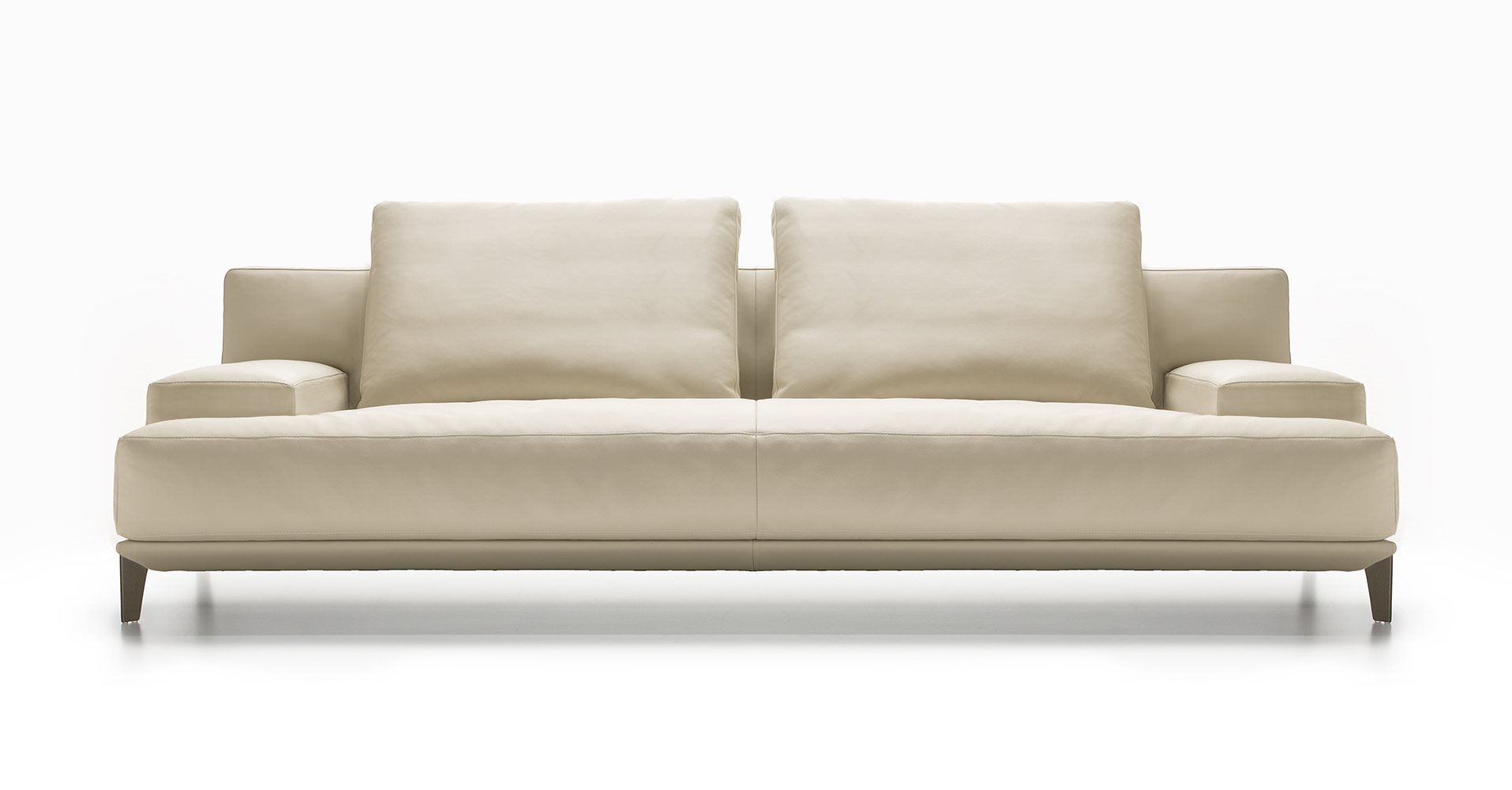 Ronny double sofa Italian manufacturer Alberta Salotti. The presented model of sofa frame made of solid wood, upholstery made of genuine leather in white tone. Removable padded armrests. The cushion filling is goose down. Low metal legs. A modern solution for living room.