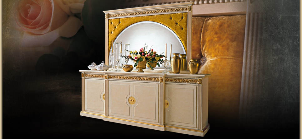 Dining room (dining set) Florence from the Italian manufacturer Cenedese. The set includes: dining table, dresser and chairs. Frame, body - natural wood. Decorative elements hand-carved in gold-plated finish. Upholstery - textiles. The model is made in classic style. Colours in stock.
