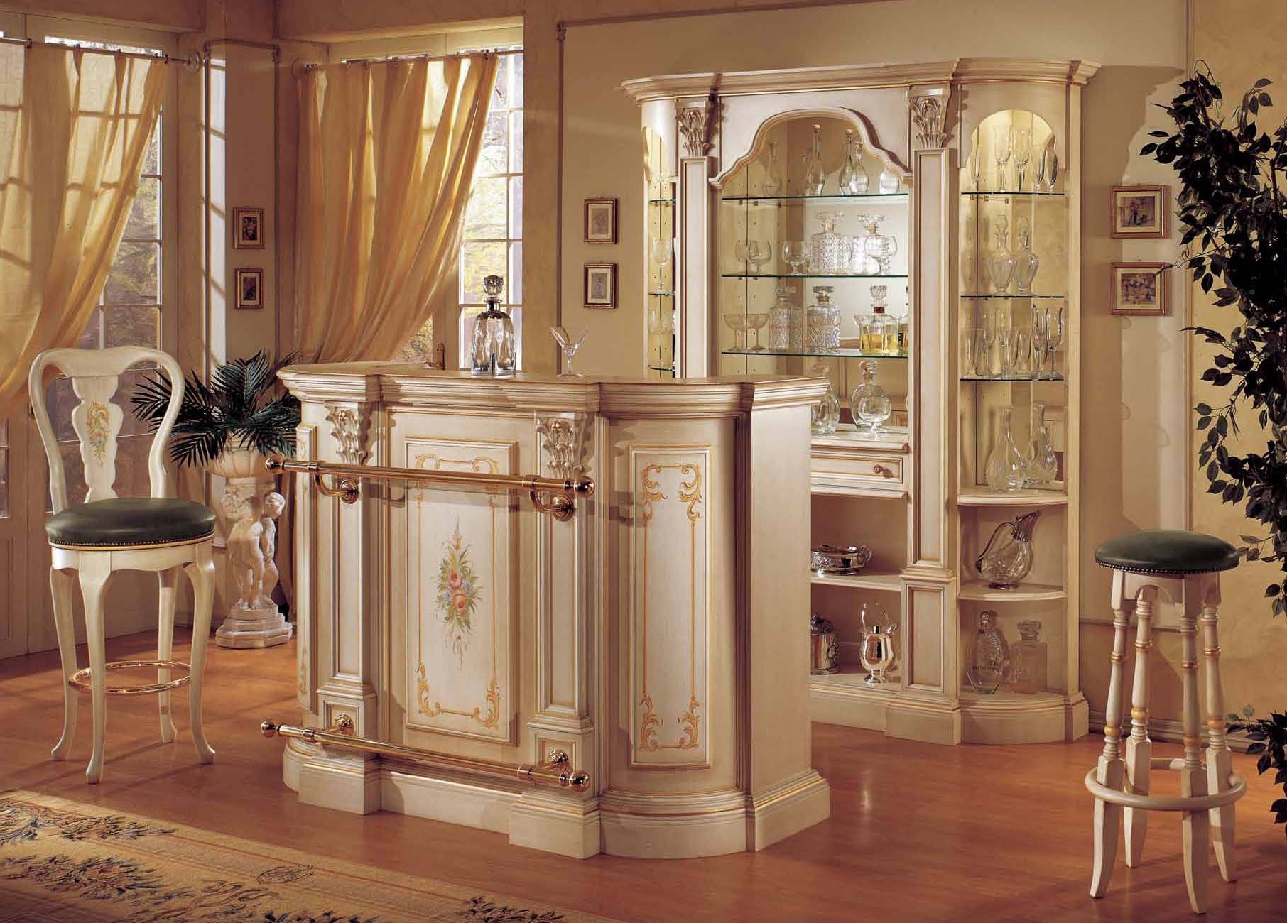Bar (Suite bar) from the Italian manufacturer Mirandola Export. The design of the facade makes the set a real work of art. The composition of the headset includes a bar counter, bar Cabinet and bar stools. The bar countertop is made of pink or green marble. Chairs with leather upholstery can be with or without backrest. Colours in stock.
