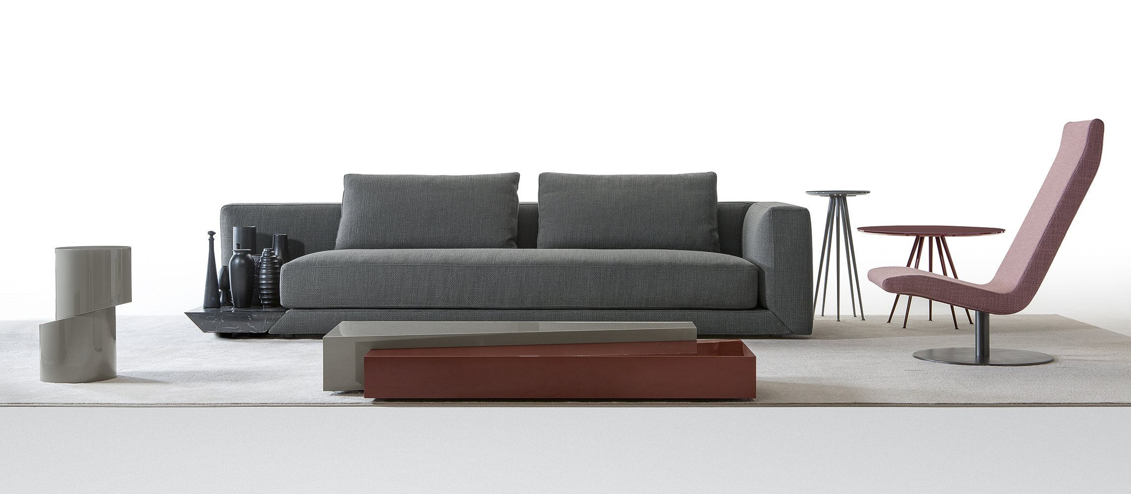 Sofa with built-in table Floyd Italian manufacturer Alberta Salotti. The presented model of sofa with built-in table of black marble. The furniture is made on a frame of solid wood, the upholstery is high-quality textiles in a dark grey tone. Rectangular cushions are removable. The modern style of execution.