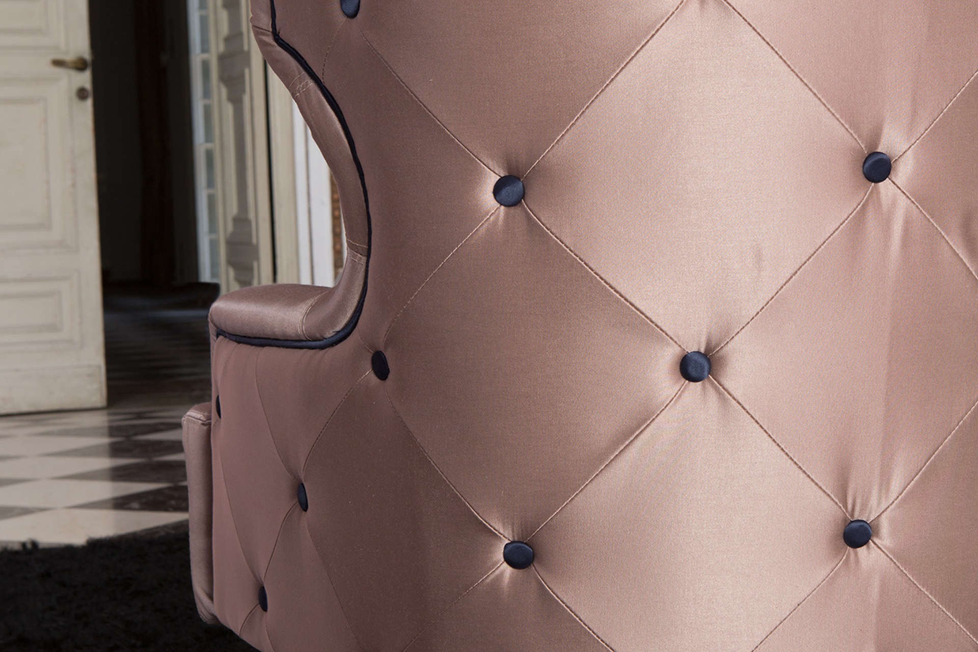 Chair Donna small from Home collections by Italian producer Domingo Salotti. Comfortable, functional seat covers, are made by the designer in style glamour ensure a comfortable daily rest. The frame and curved legs poplar wood, or fir wood, lacquered legs. Padding - monochrome textiles from the company portfolio. The outer part of the back fitted quilted diamonds and adorned with buttons in contrasting colors. The contour of the backrest are decorated with Welt. Used in finishing silver foil. The filler is polyurethane foam and Dacron. Seat with extra volume. Colors to choose from a collection company.