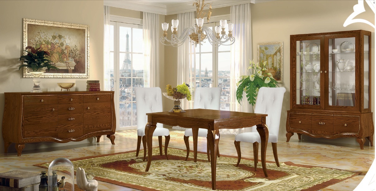 Chantal set for the dining room from Italian manufacturer Arve Style. The set includes: dining table sofa, chairs upholstered in white eco-leather, sideboard and showcase. Frame, base, top made of solid wood. Finish - porous veneer walnut wood with a clear wood structure. Gilded hardware lends a headset luxury and charm. To choose a rich shade palette.