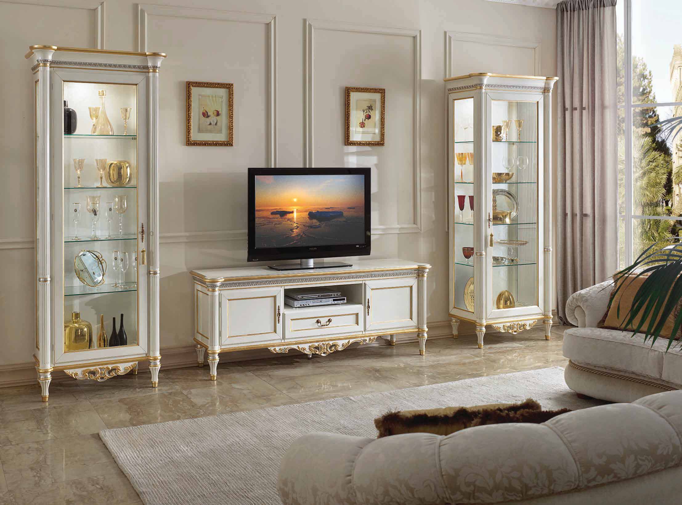 Showcase from Italian manufacturer Scappini & C. the Frame is natural wood. Decorative elements hand-carved in gold-plated finish. Shutters, shelves - glass. The model is made in classic style. Colours in stock.