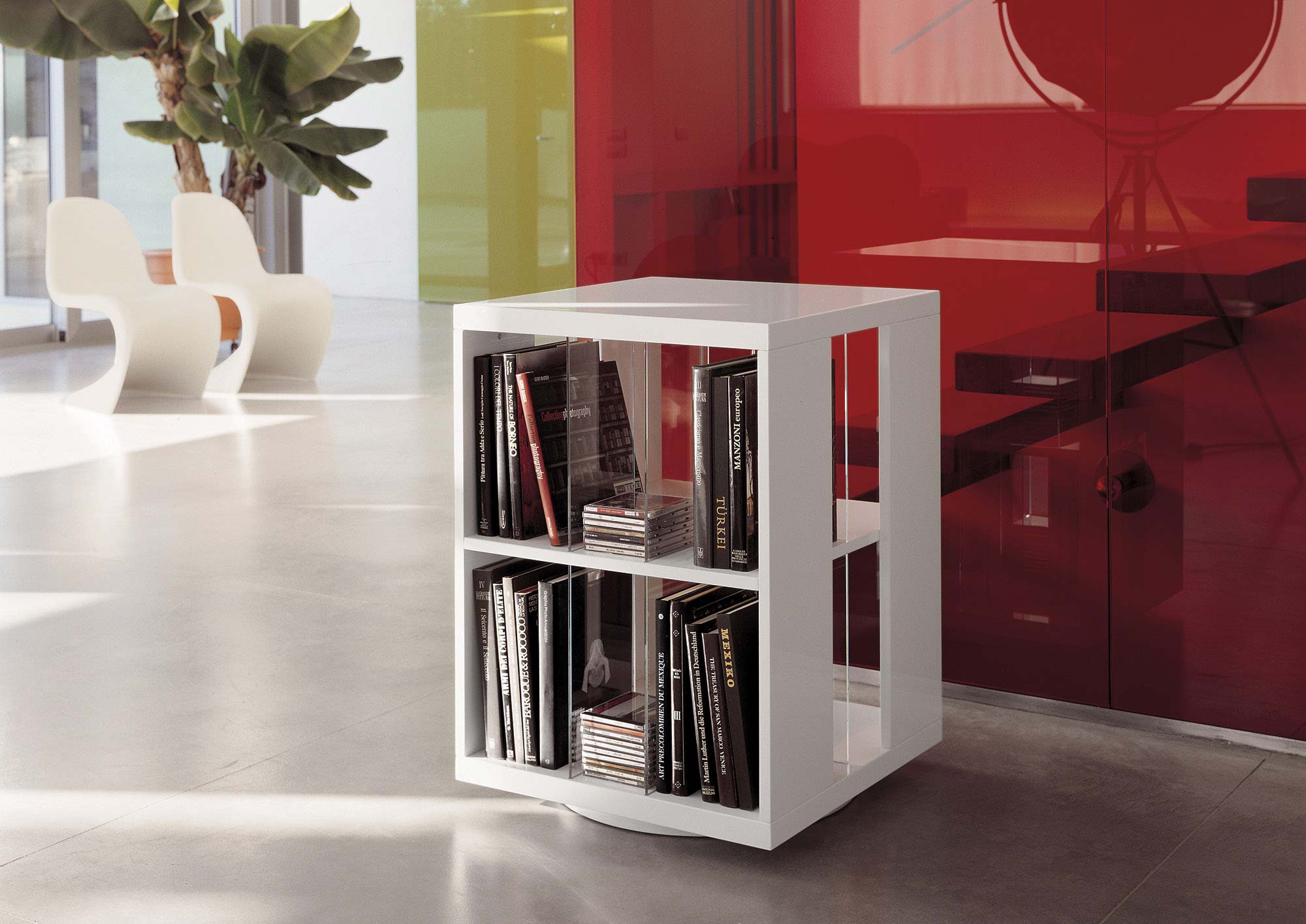 The rack 122 Thea from the Italian manufacturer Longhi. The trim is made of veneer wood, lacquered, partitions - glass. Model on a swivel base will decorate the living room in a modern style. Colors: white, brown, natural wood color.