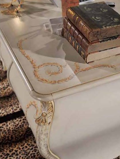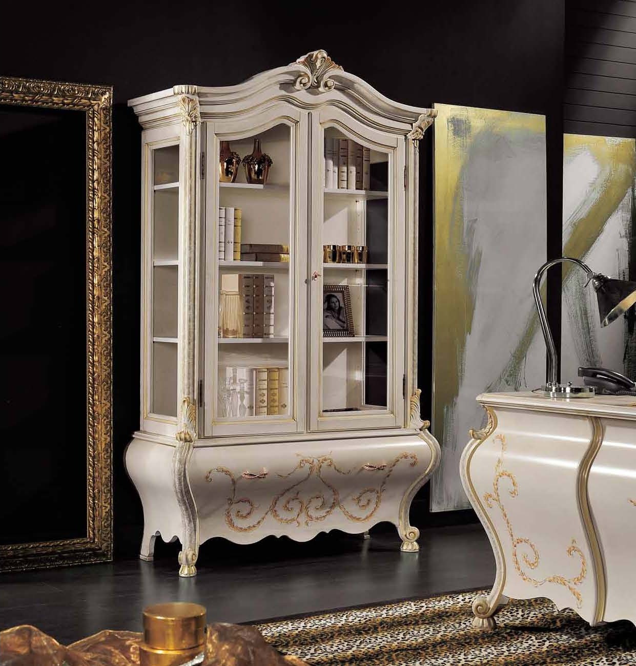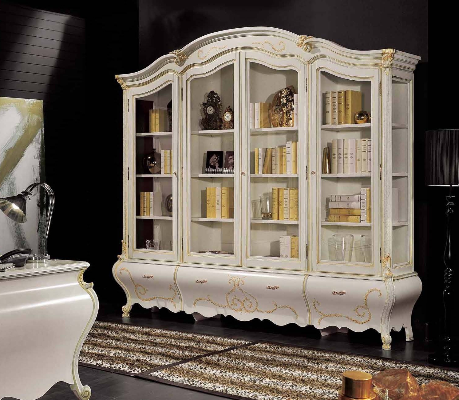The office (Suite office) from the Italian manufacturer Mirandola Export. Products are made in the classic style, wooden frame. Set consists of two bookshelves with glass doors, shelves and drawers, Desk with seven drawers and swivel chair, with leather upholstery, on castors and height adjustable. The fa?ade of the items are decorated with a decorative pattern and inlaid with Swarovski stones. Set Mirandola Export is the best choice for Your office.