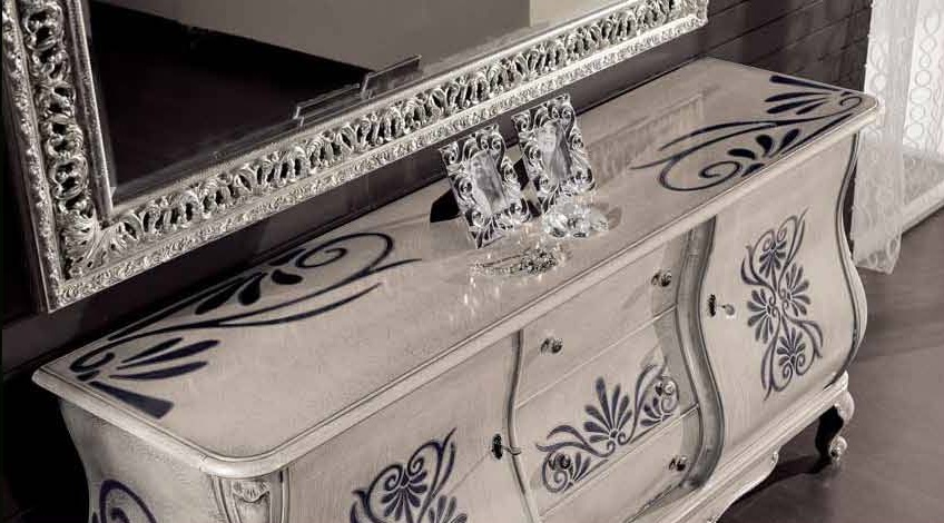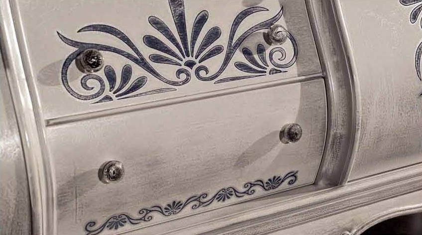 Stand from Italian manufacturer Mirandola Export. The model is made in a mixed style. The frame is made of wood. The Cabinet has two doors and three drawers. The product is decorated with original decorative pattern. Beautiful dresser on elegant legs will attract attention and will decorate Your interior.