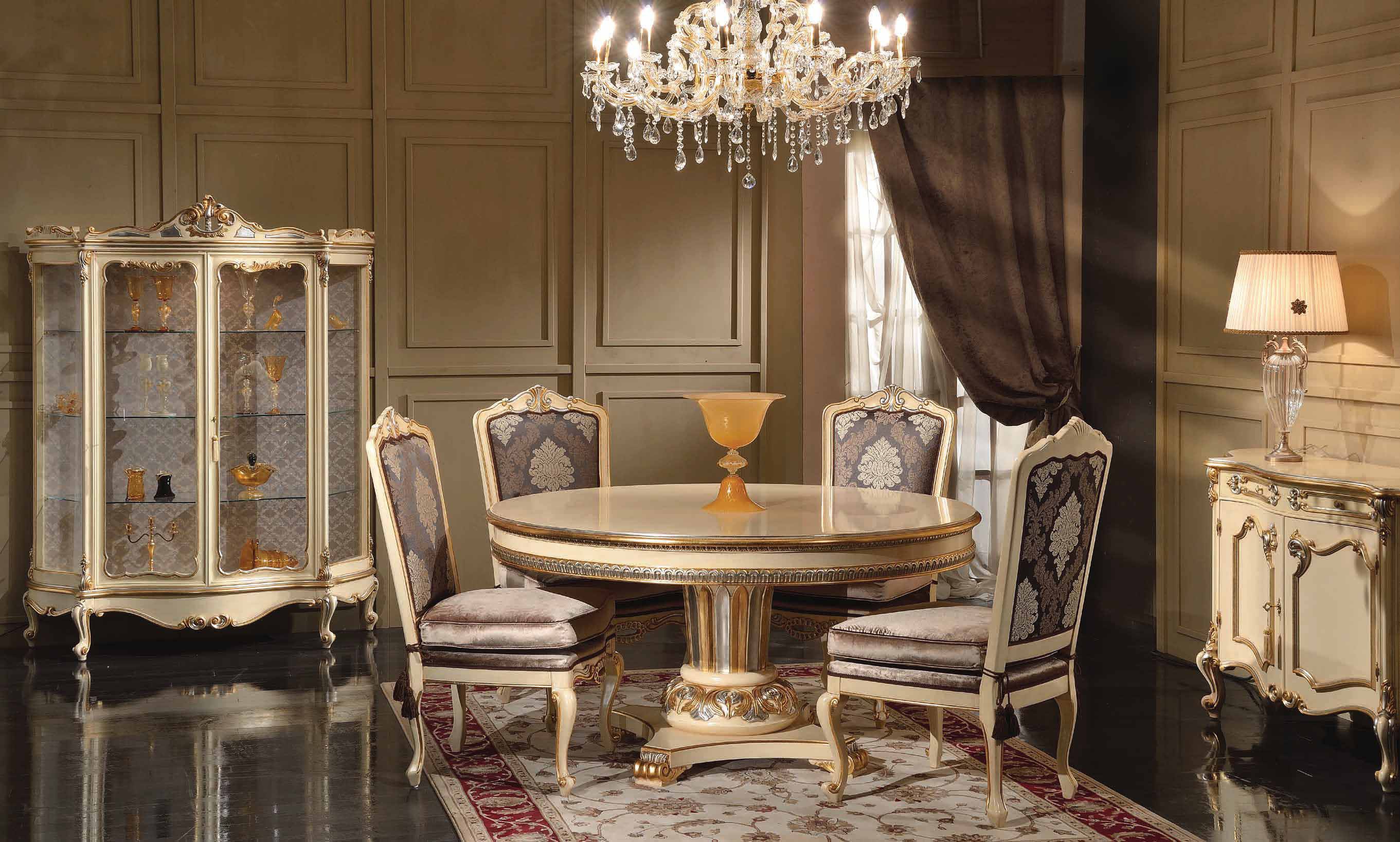 Dining room (dining set) from the Italian manufacturer Scappini & C. the set includes: dining table, chairs and a showcase. The frame is natural wood, hand carved. Sash - glass. Upholstery - textiles. The finishing - varnish. The model is made in classic style. Colours in stock.