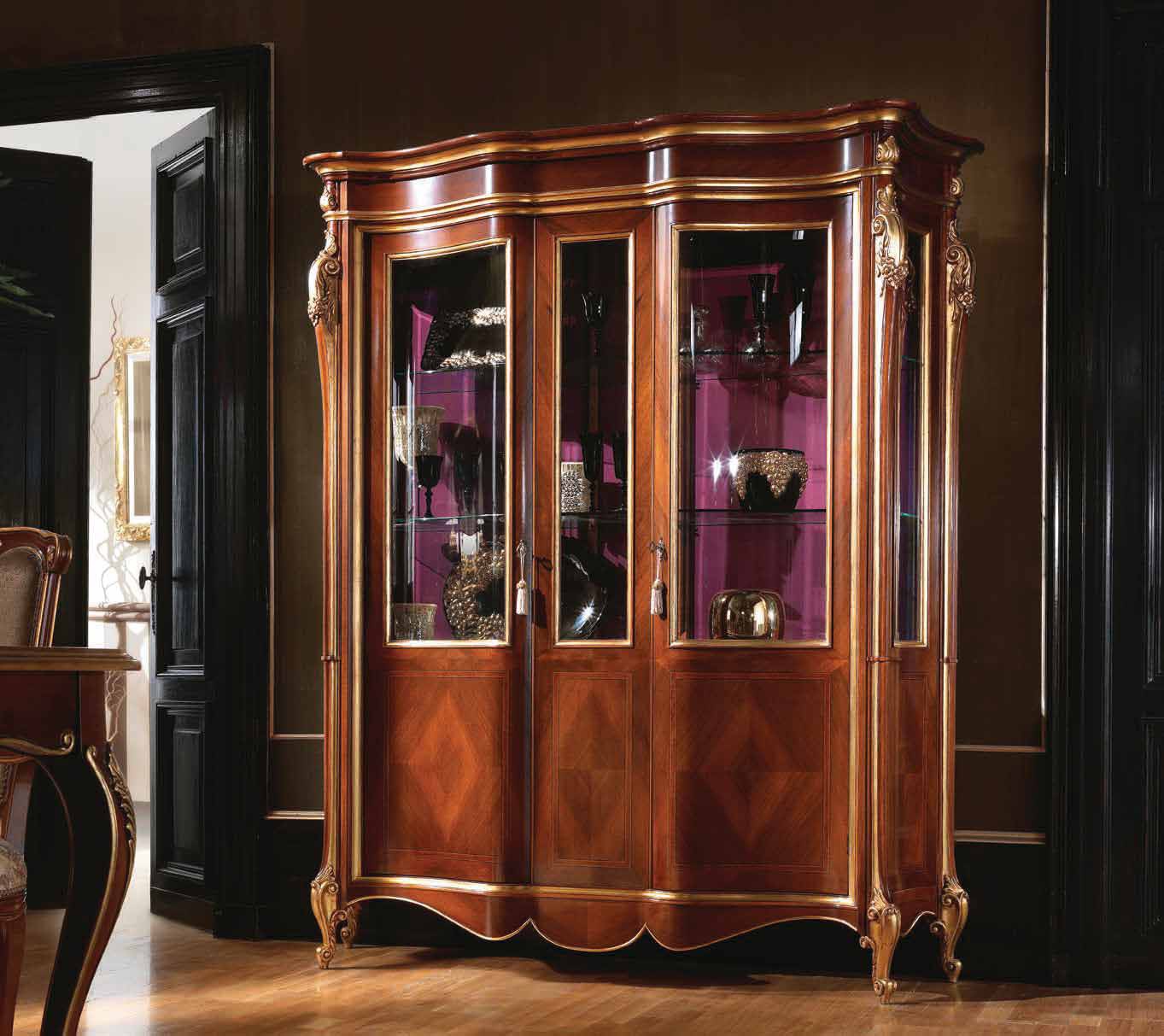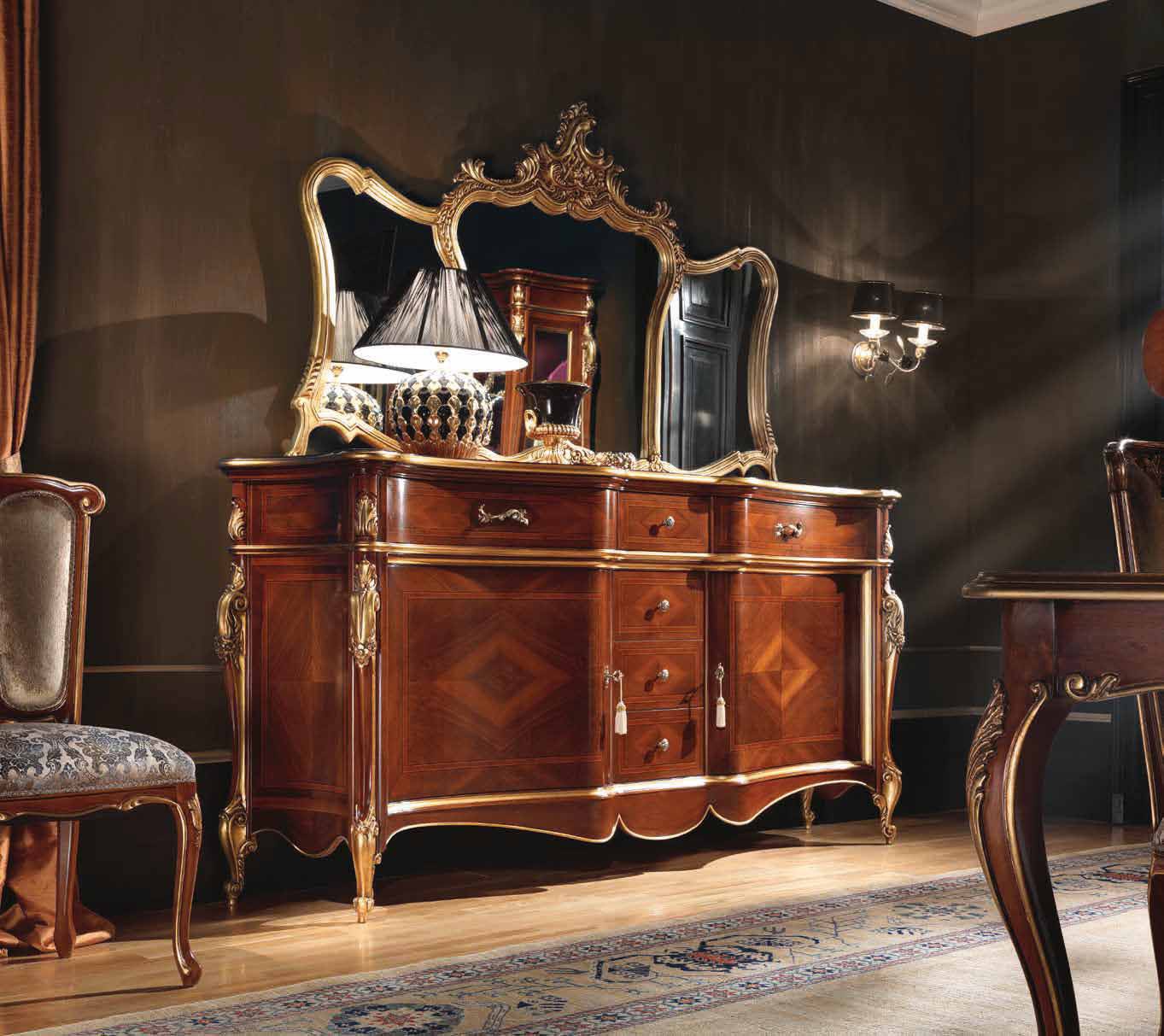 Dining room (dining set) from the Italian manufacturer Scappini & C. the set includes: dining table, chairs, sideboard and showcase. Frame, body - natural wood, hand carved. Sash - glass. Handles - metal. Upholstery - textiles. The model is made in classic style. Colours in stock.