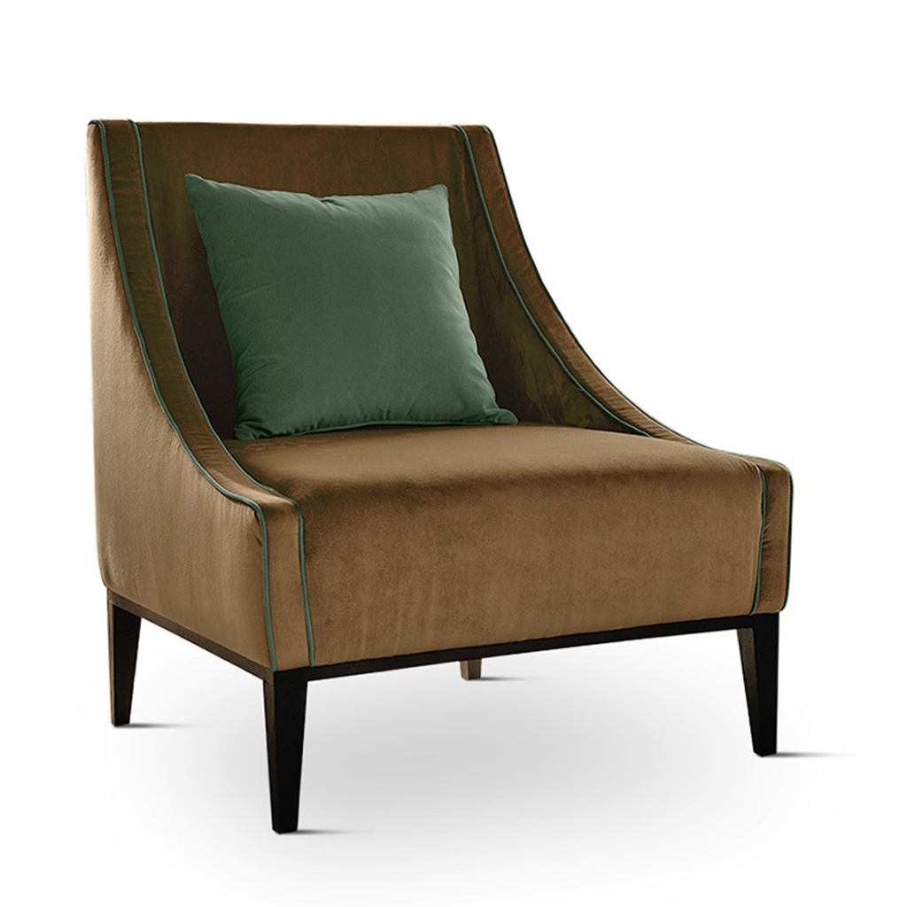 Chair Sikka from the collection Home from the Italian manufacturer Domingo Salotti. Comfortable chair with classic proportions can be used in almost any room. Made on a frame of solid poplar or fir wood, legs made of beech, finished in wenge. Back and seat upholstered in plain fabrics from a range of companies, filling - foam with the addition of Dacron. The armrests are trimmed with edge to match the pillow. Colors to choose from a collection company.