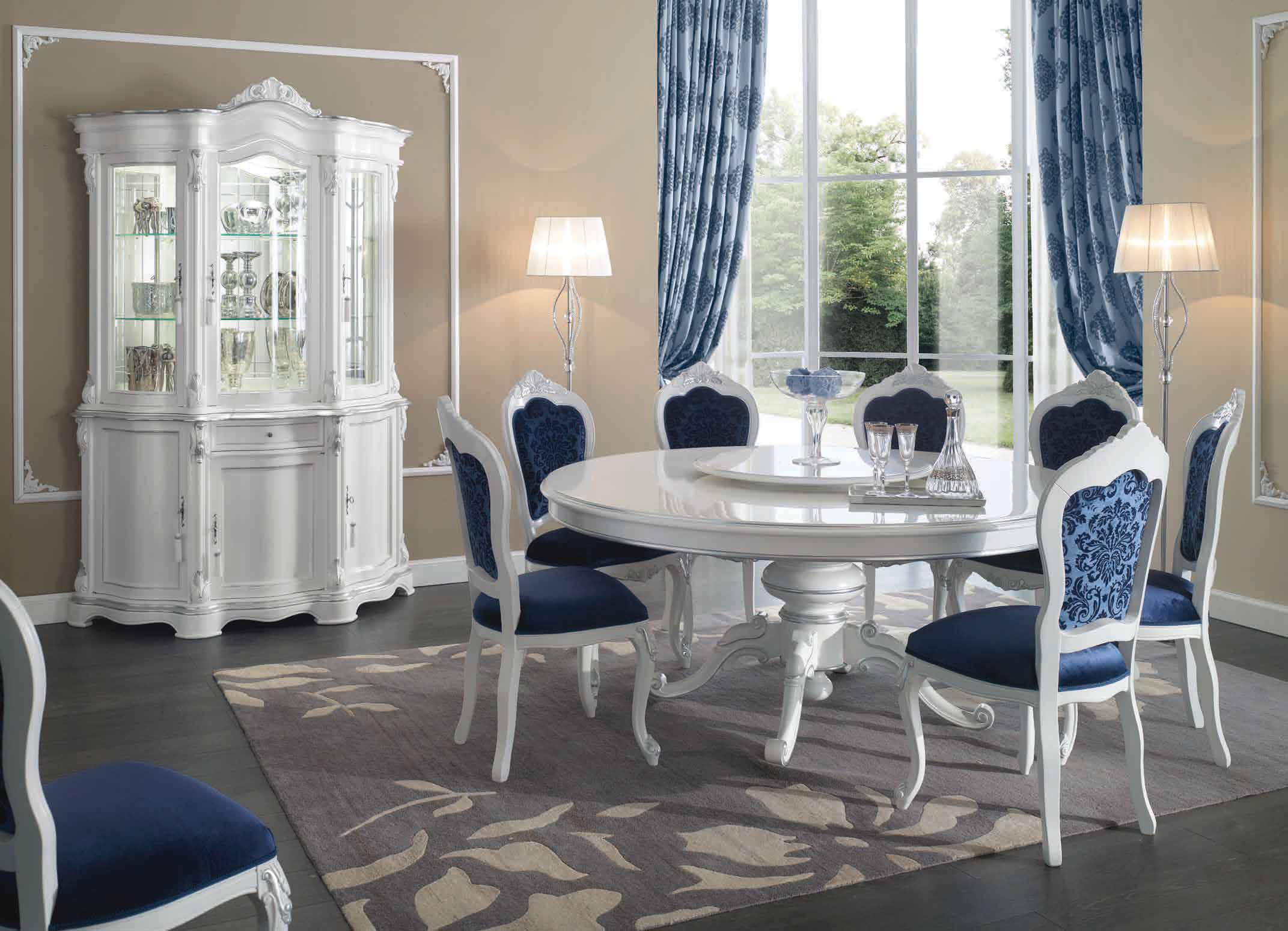 Dining room (dining set) from the Italian manufacturer Scappini & C. the set includes: dining table, chairs and a showcase. Frame, body - natural wood, hand carved. Sash - glass. Handles - metal. Upholstery - textiles. The model is made in classic style. Colours in stock.