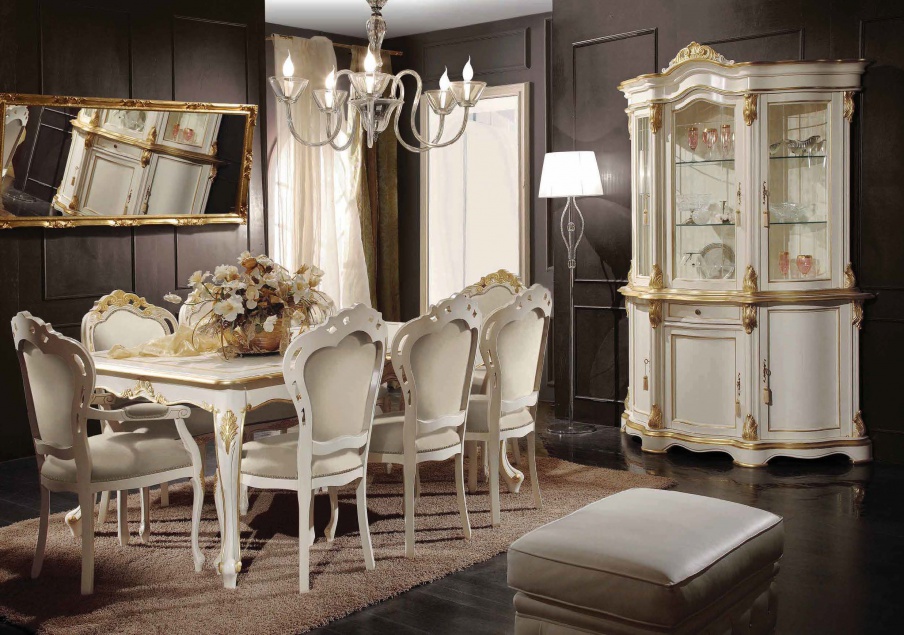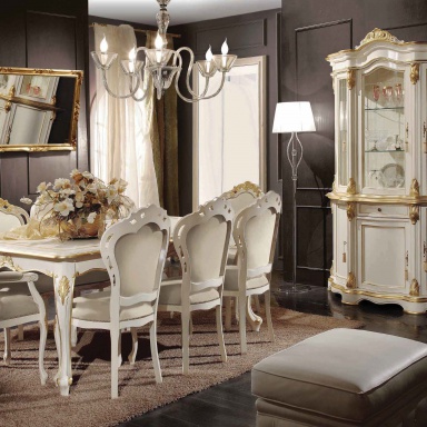 Dining room (dining set) from the Italian manufacturer Scappini & C. the set includes: dining table, chairs and a showcase. Frame, body - natural wood, hand carved. Sash - glass. Handles - metal. Upholstery - textiles. Finish - Matt lacquer. The model is made in classic style. Colours in stock.