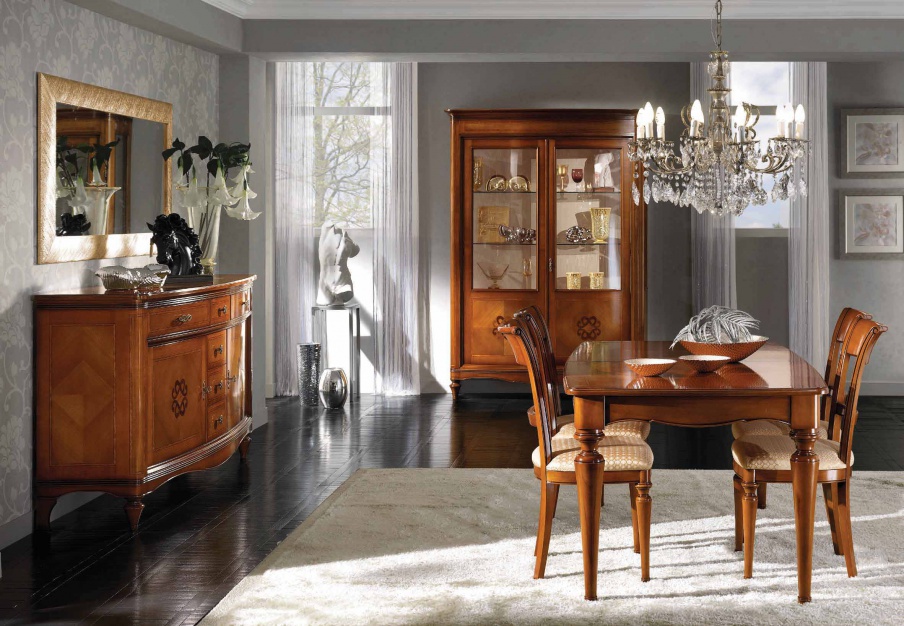 Dining room (dining set) from the Italian manufacturer Scappini & C. the set includes: dining table, chairs, sideboard and showcase. Frame, body - natural wood, hand carved. Finish - gloss lacquer. Sash - glass. Handles - metal. Upholstery - textiles. The model is made in classic style. Colours in stock.