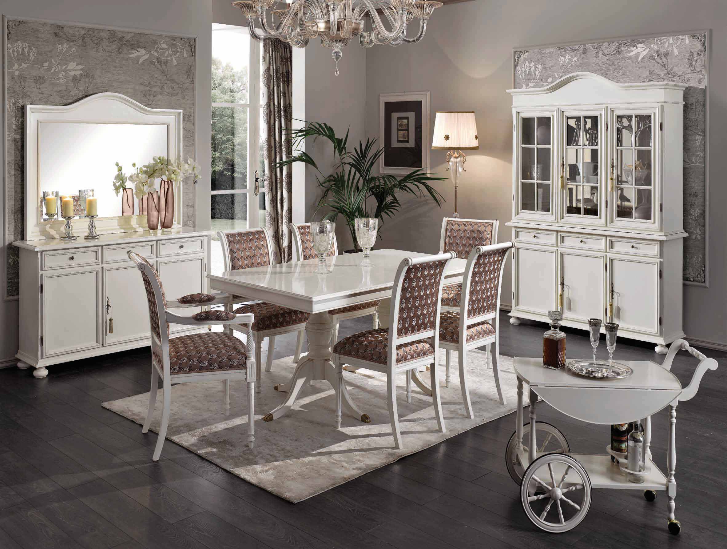 Dining room (dining set) from the Italian manufacturer Scappini & C. the set includes: dining table, chairs, sideboard and showcase. Frame, body - natural wood, hand carved. The finishing - varnish. Sash - glass. Handles - metal. Upholstery - textiles. The model is made in classic style. Colours in stock.