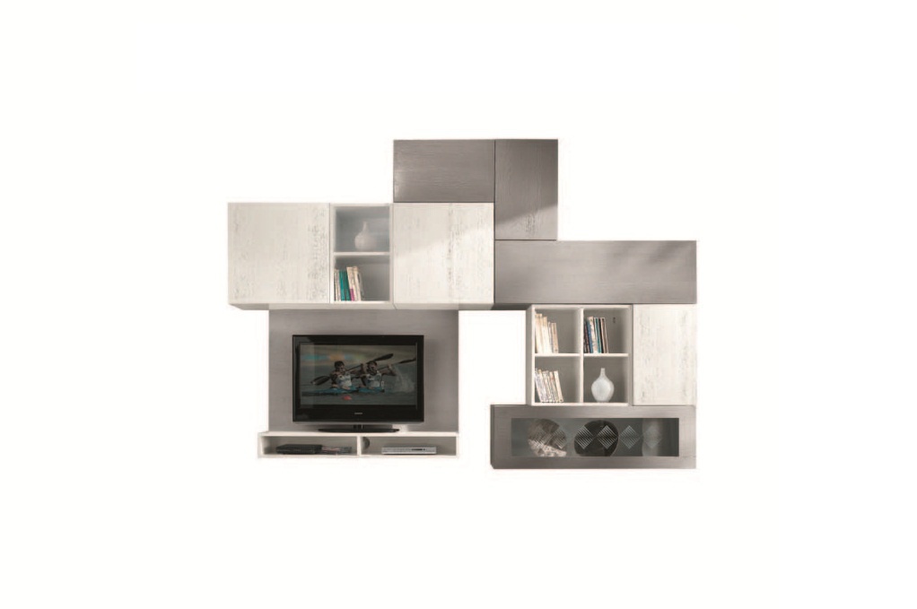The modular storage system of Giselle from the Italian manufacturer Arve Style. The module consists of hinged boxes that open niches, panel for TV. Frame, base made of solid wood. Finish shown in gray lacquer with a silvery patina that emphasizes the wood structure. Design modern, ergonomic. A perfect choice for a stylish interior. Offers a wide selection of palettes.