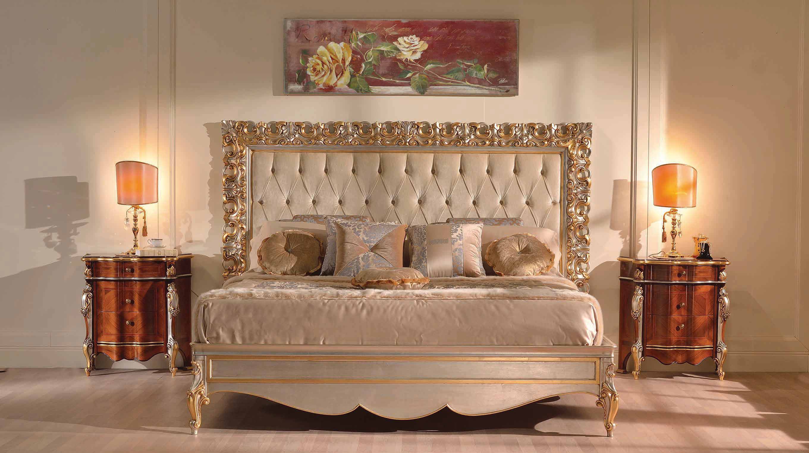 Double bed from Italian manufacturer Scappini & C. the Frame is natural wood. Decorative elements hand-carved in gold-plated finish. Headboard embellished with stitch Capito. Upholstery - textiles. The model is made in classic style. Colours in stock.