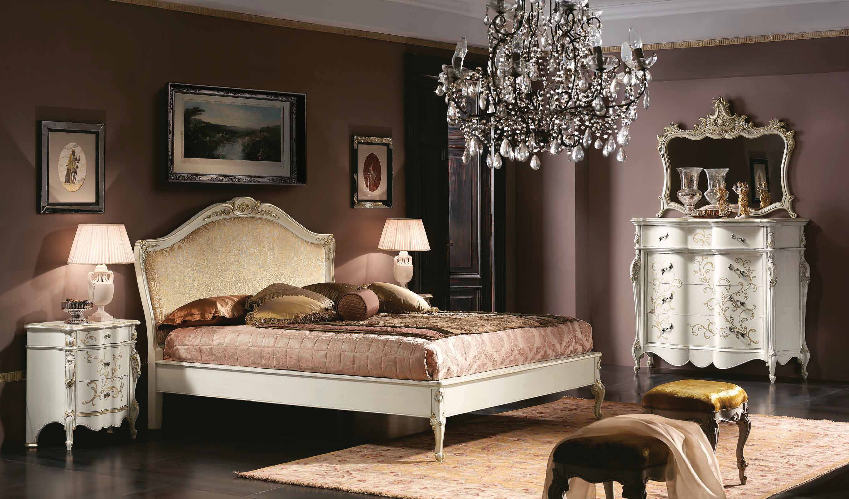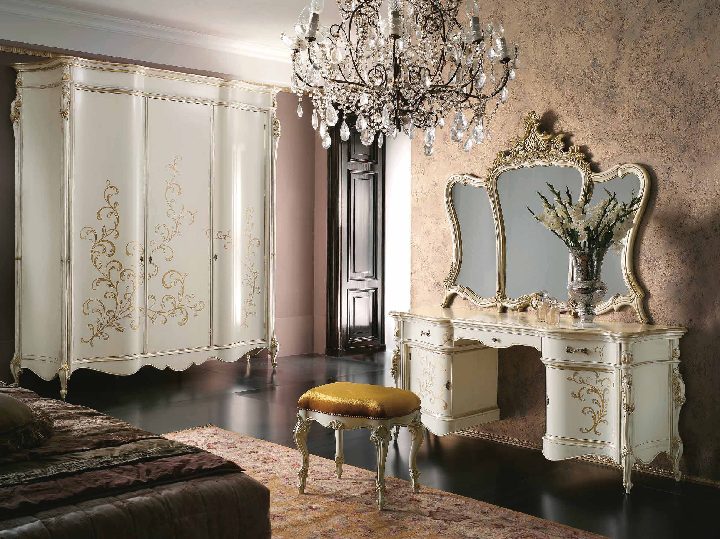 Bedroom (Suite bedroom) from the Italian manufacturer Scappini & C. the set includes: double bed, bedside tables, chest of drawers, dressing table and wardrobe. Frame, body - natural wood, hand carved. Upholstery - textiles. The model is made in classic style. Colours in stock.
