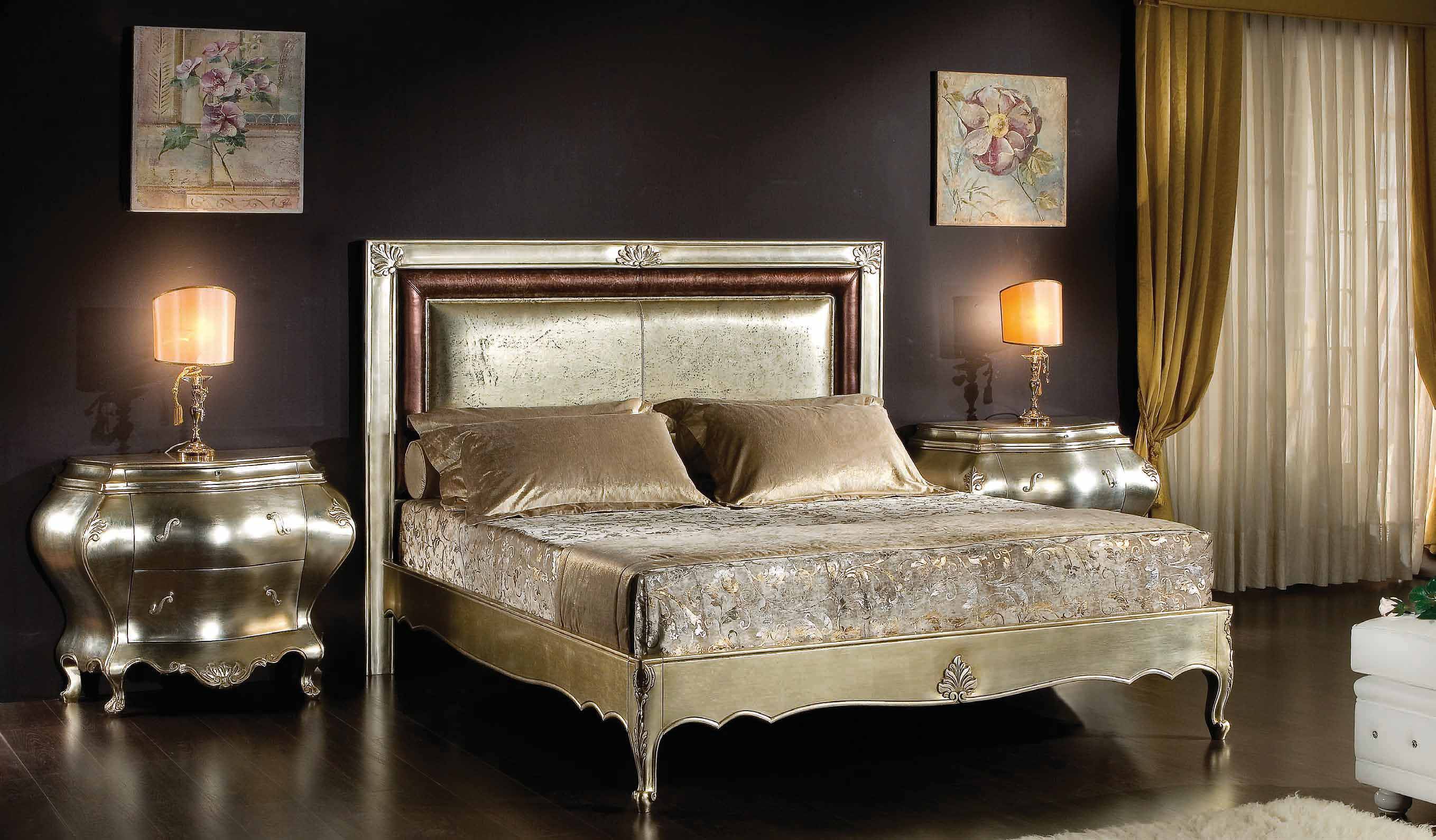 Double bed from Italian manufacturer Scappini & C. the Frame is natural wood, hand carved. Finish - silver plated. Upholstery - textiles. The model is made in classic style. Colours in stock.
