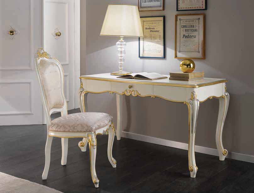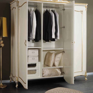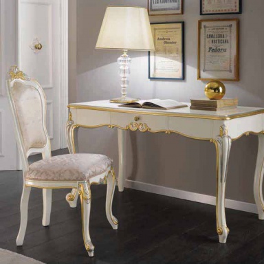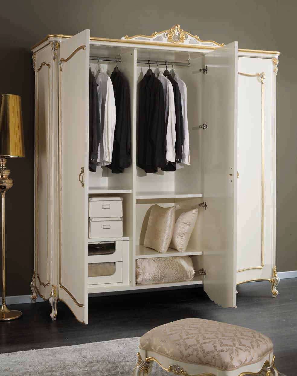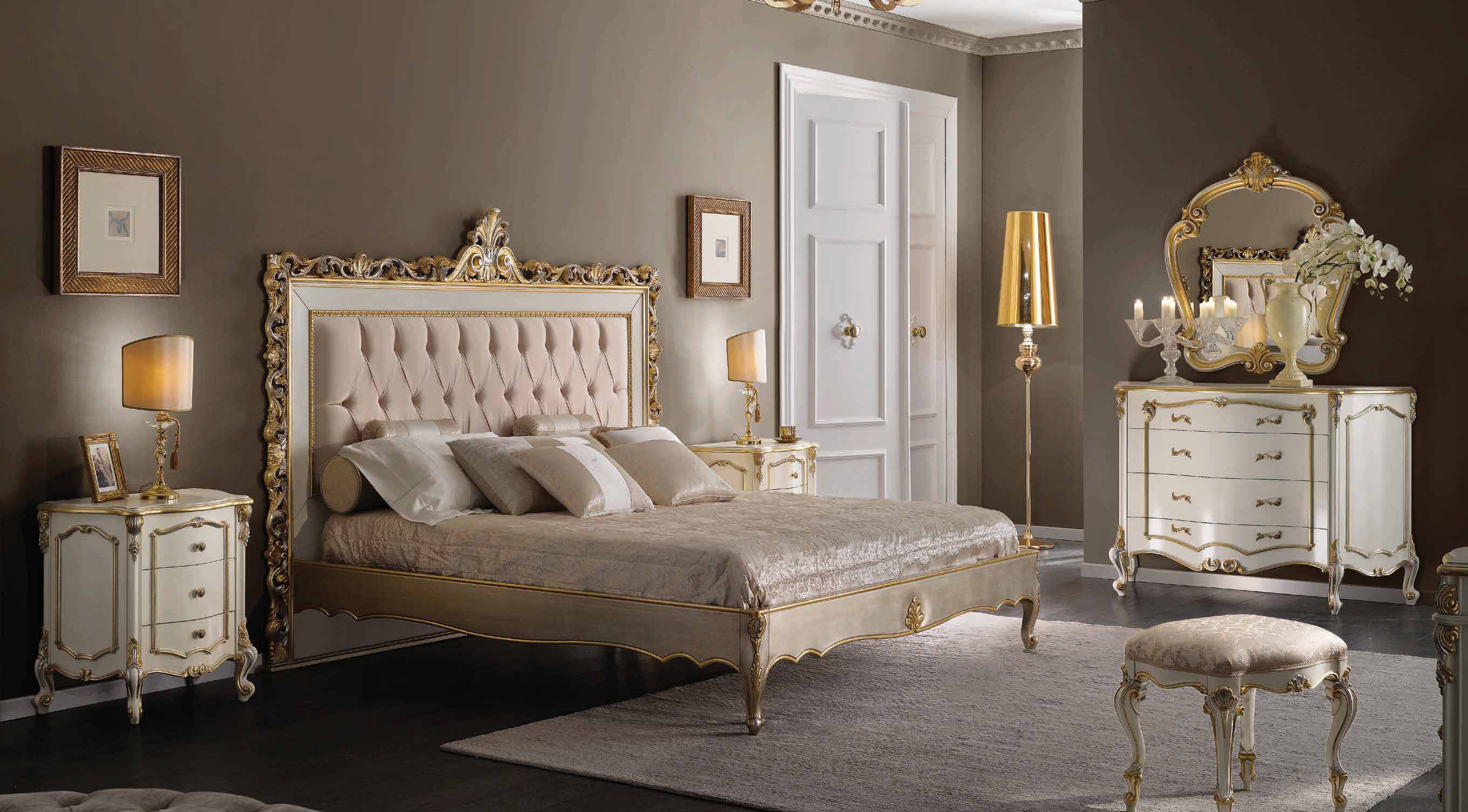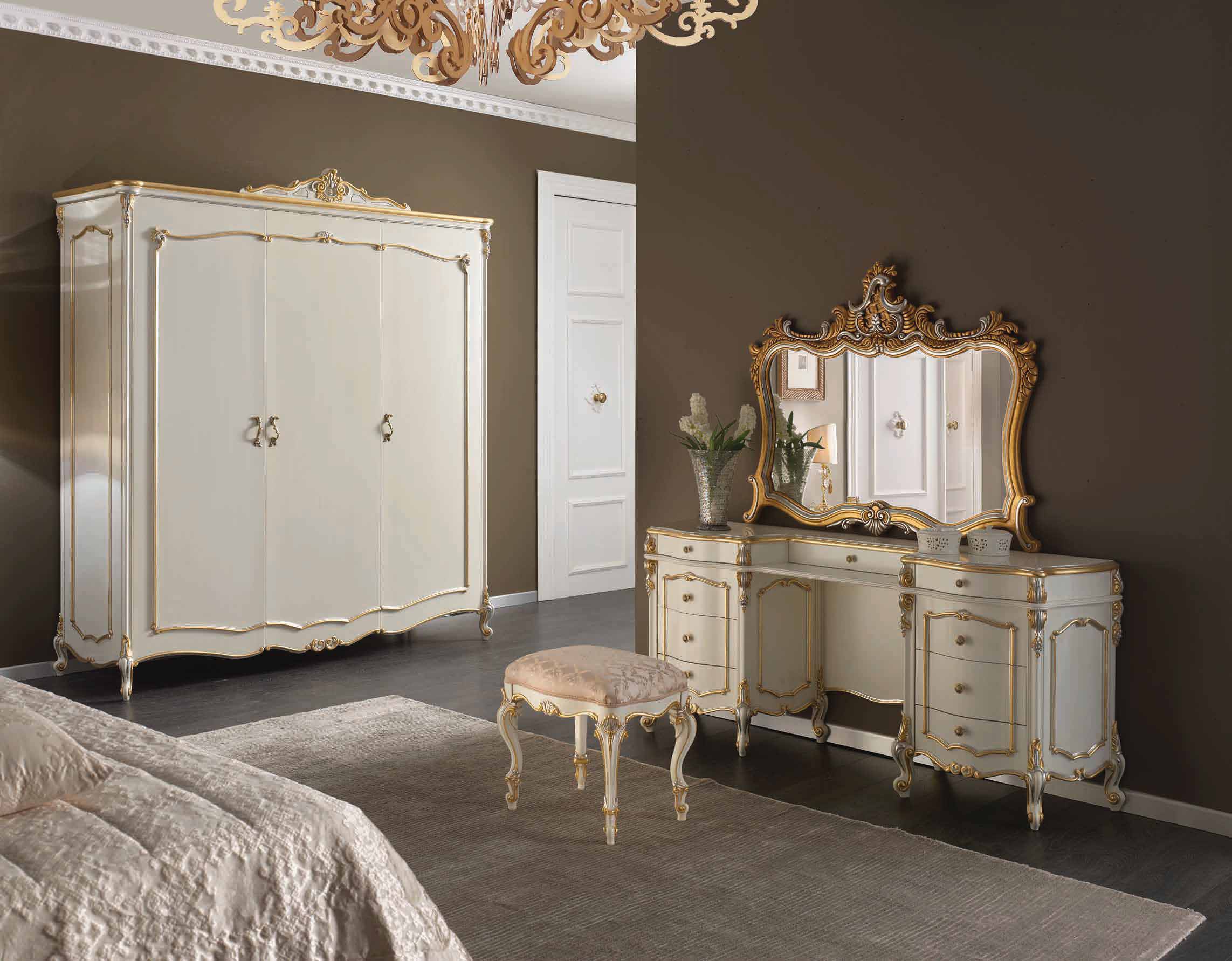 Bedroom (Suite bedroom) from the Italian manufacturer Scappini & C. the set includes: double bed, bedside table, chest of drawers, wardrobe and dressing table. Frame, body - natural wood. Decorative elements hand-carved in gold-plated finish. Handles - metal. Upholstery - textiles. The model is made in classic style. Colours in stock.