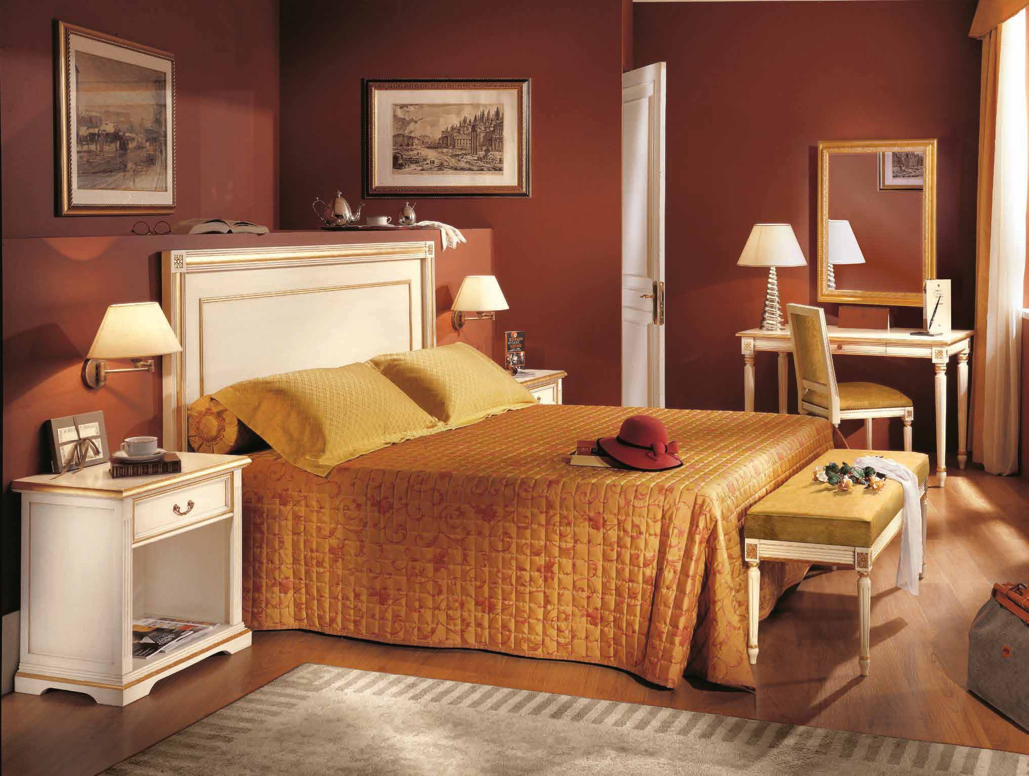 Bedroom (Suite bedroom) from the Italian manufacturer Scappini & C. the set includes: double bed, bedside table, Desk and bench. Frame, body - natural wood, hand carved. Handles - metal. Upholstery - textiles. The model is made in classic style. Colours in stock.