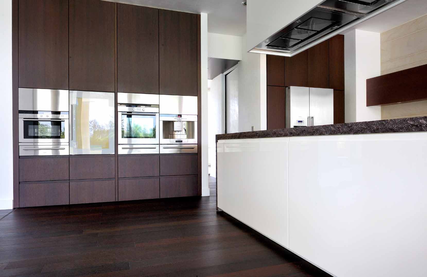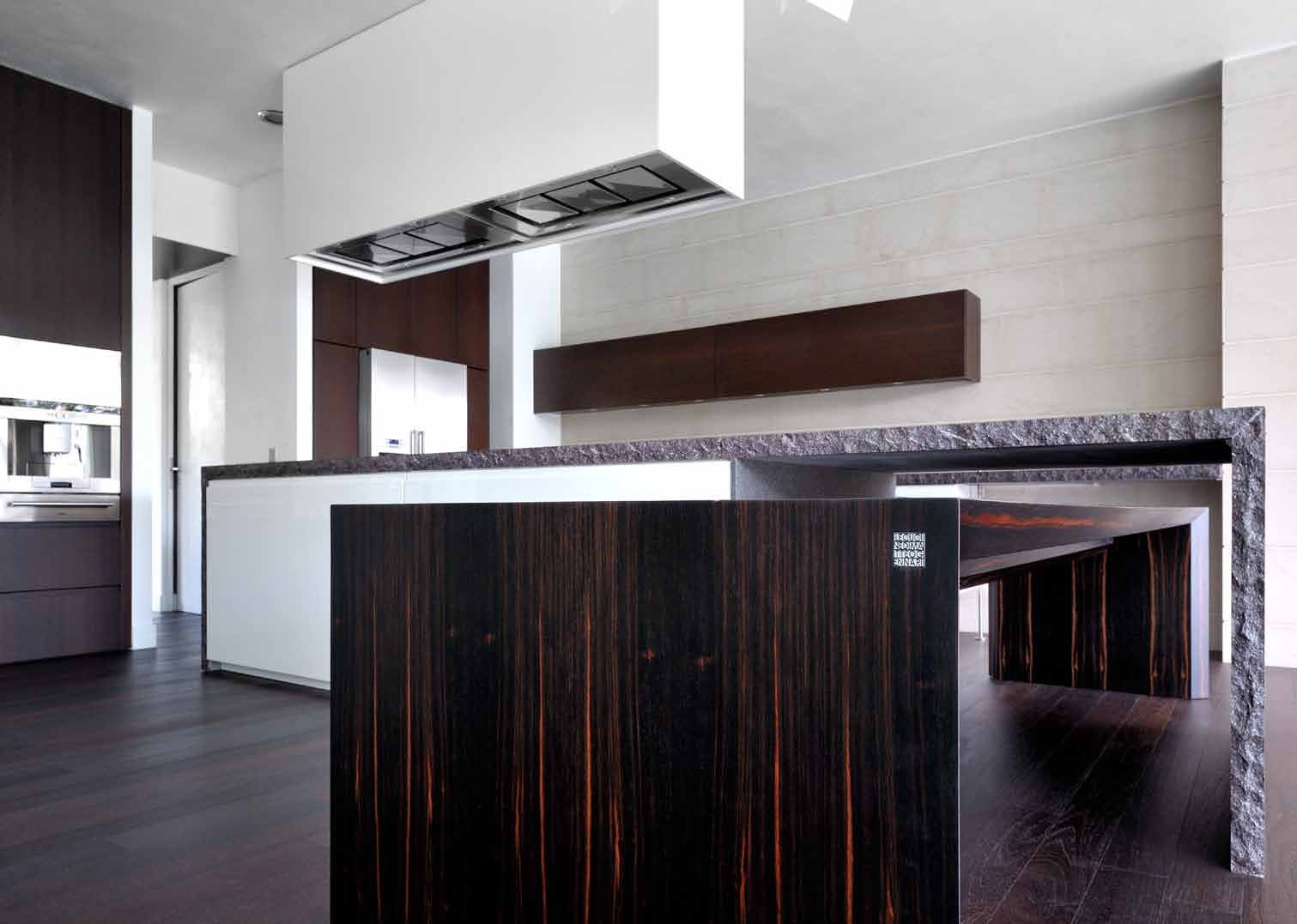 Kitchen (kitchen set) Stellenbosch from Italian producer Matteo Gennari. The case is natural wood. Finish - lacquered. The countertop is a stone monolith of Porphyry and Macassar Ebony. The model is made in modern style. Colours in stock.
