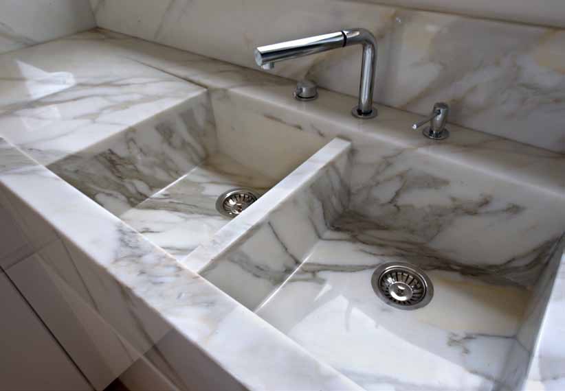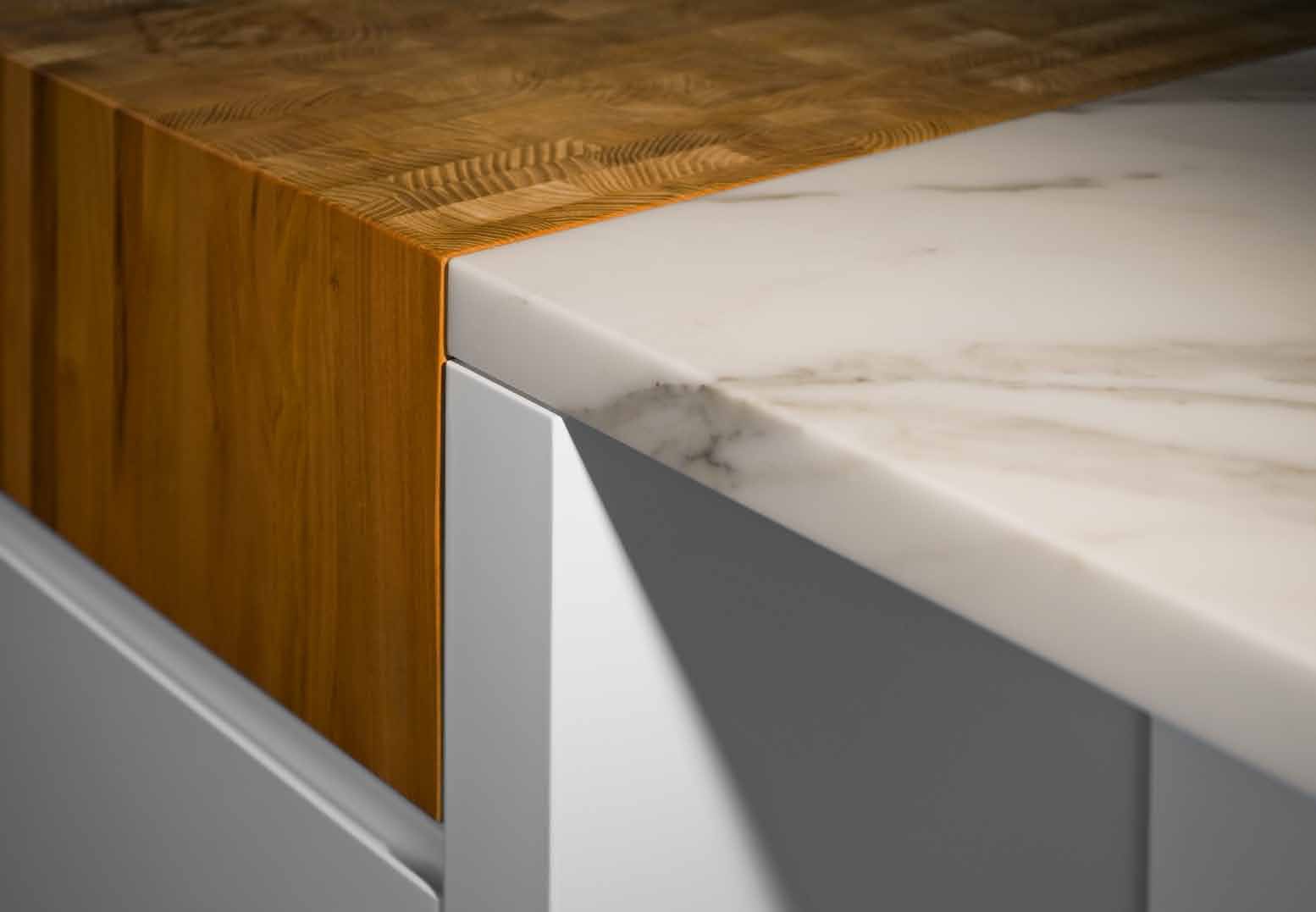 Kitchen (kitchen set) Emilia from Italian producer Matteo Gennari. The case is natural wood. Finish - gloss lacquer. The countertop is Calacatta marble. The model is made in modern style. Colours in stock.
