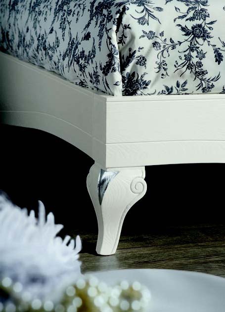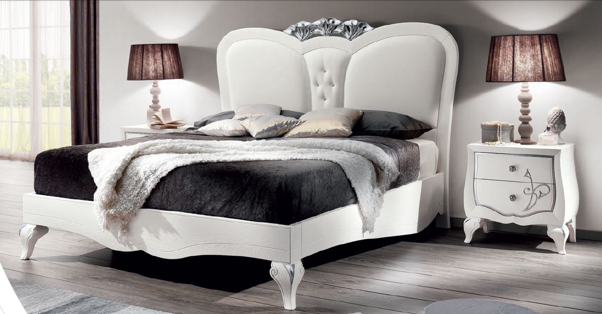 Chantal bed from Italian manufacturer Arve Style. Bed with high upholstered headboard. Base, frame made from solid wood. Finish headboard is eco-leather. The frame is covered with matte white lacquer. Decoration are Swarovski crystals, silver, carving. The bed fits perfectly in a stylish bedroom, fills the interior with elegance and charm.