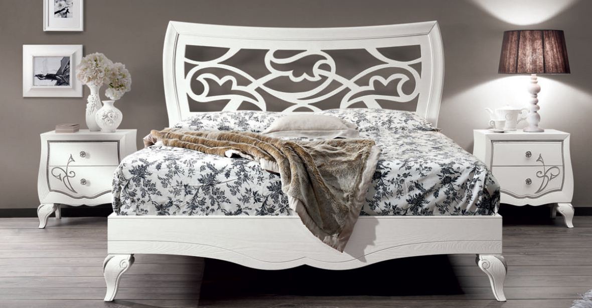 Chantal bed from Italian manufacturer Arve Style. Bed with tall carved headboard. Base, frame made from solid wood. The frame at the finish from varnish to white. Decoration elements are carved, silver leaf. The bed fills the interior with elegance and sophistication. Available in a wide palette of shades.