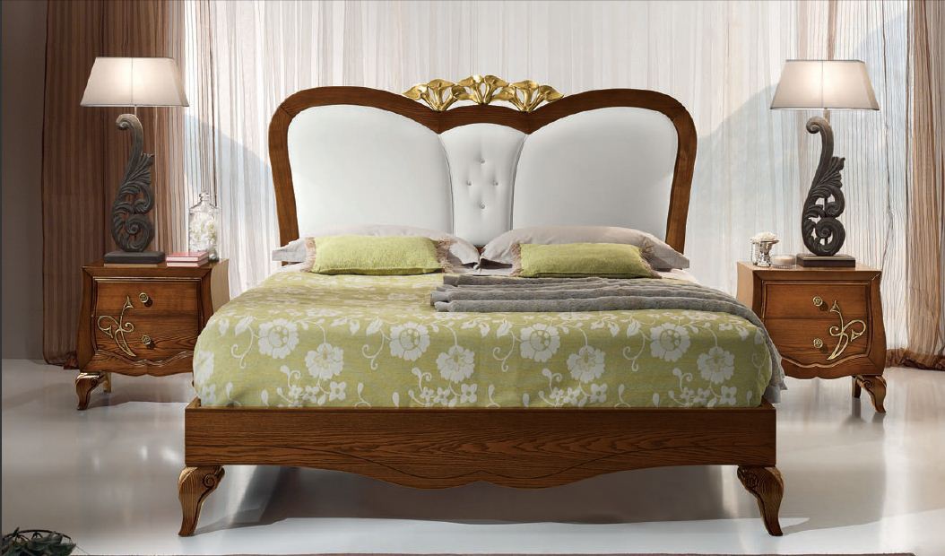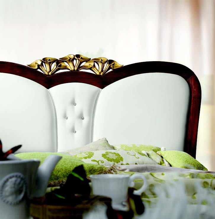 Chantal bed from Italian manufacturer Arve Style. Bed with high upholstered headboard. Base, frame made from solid wood. Finish headboard is eco-leather in white colour. Frame - finish walnut veneer. Embellishment are Swarovski crystals, gold leaf, carving. The bed will fill your bedroom with elegance and charm. The choice of a wide palette of shades.