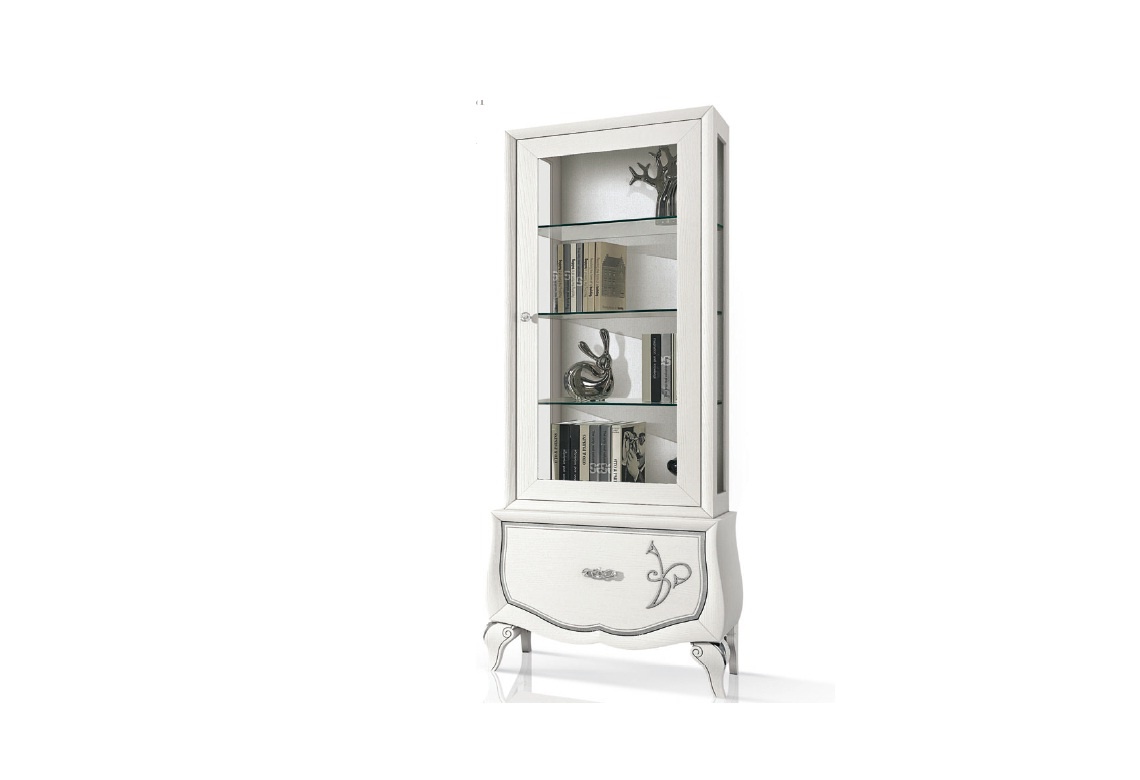 Showcase Chantal from the Italian manufacturer Arve Style. Product with one fold, pull-out drawer. The base frame is made of solid wood. The wing shelf is made of glass. Accessories exquisite metal. The finish is white lacquer. The surface is porous. Decoration is floral decoration in leaf silver. A great choice for living room, study. The choice of a wide range of finishing material.