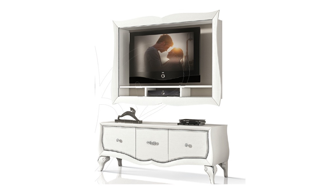 Cabinet for TV Chantal Italian manufacturer Arve Style. The Cabinet can be supplemented with a frame for TV. The product on figured legs with 3 sections. The base frame is made of solid wood. The refined furniture, made of metal. The finish is white lacquer with patina of silver, highlighting the wood structure. Decor stands floral pattern in silver leaf. A luxurious choice for fine living. Represented a wide range of finishing material.