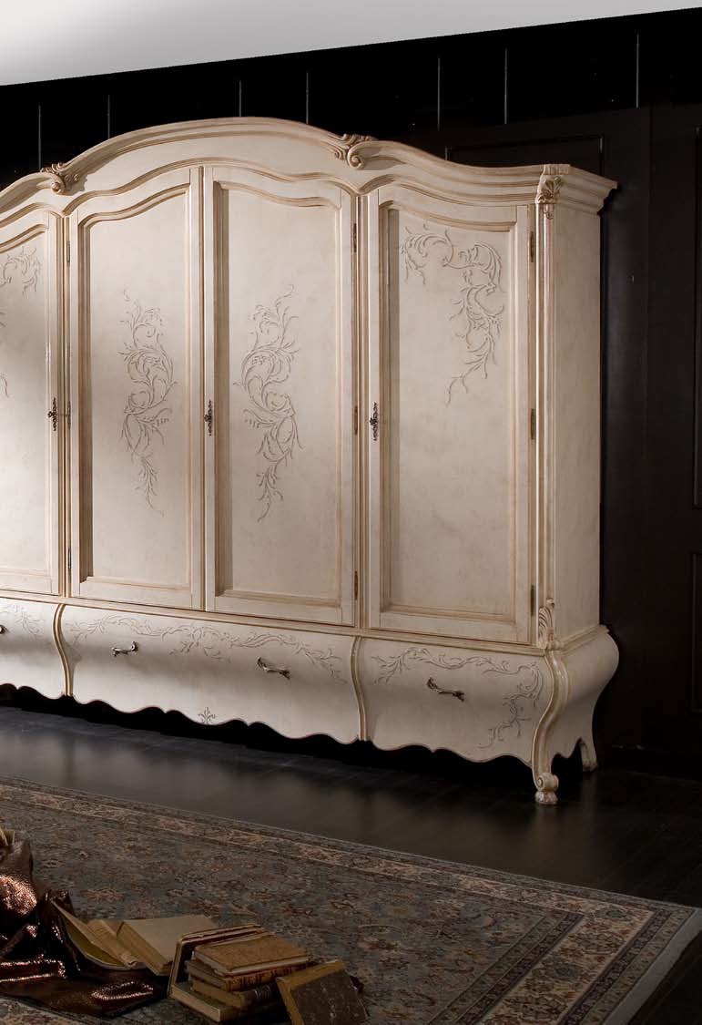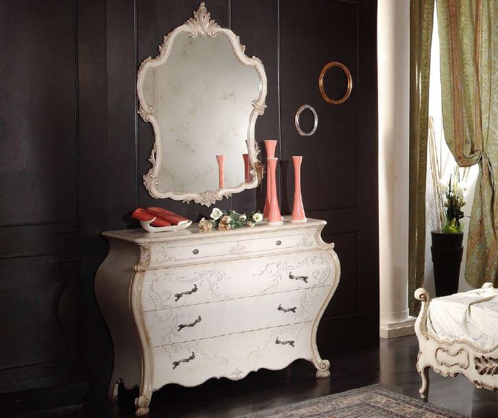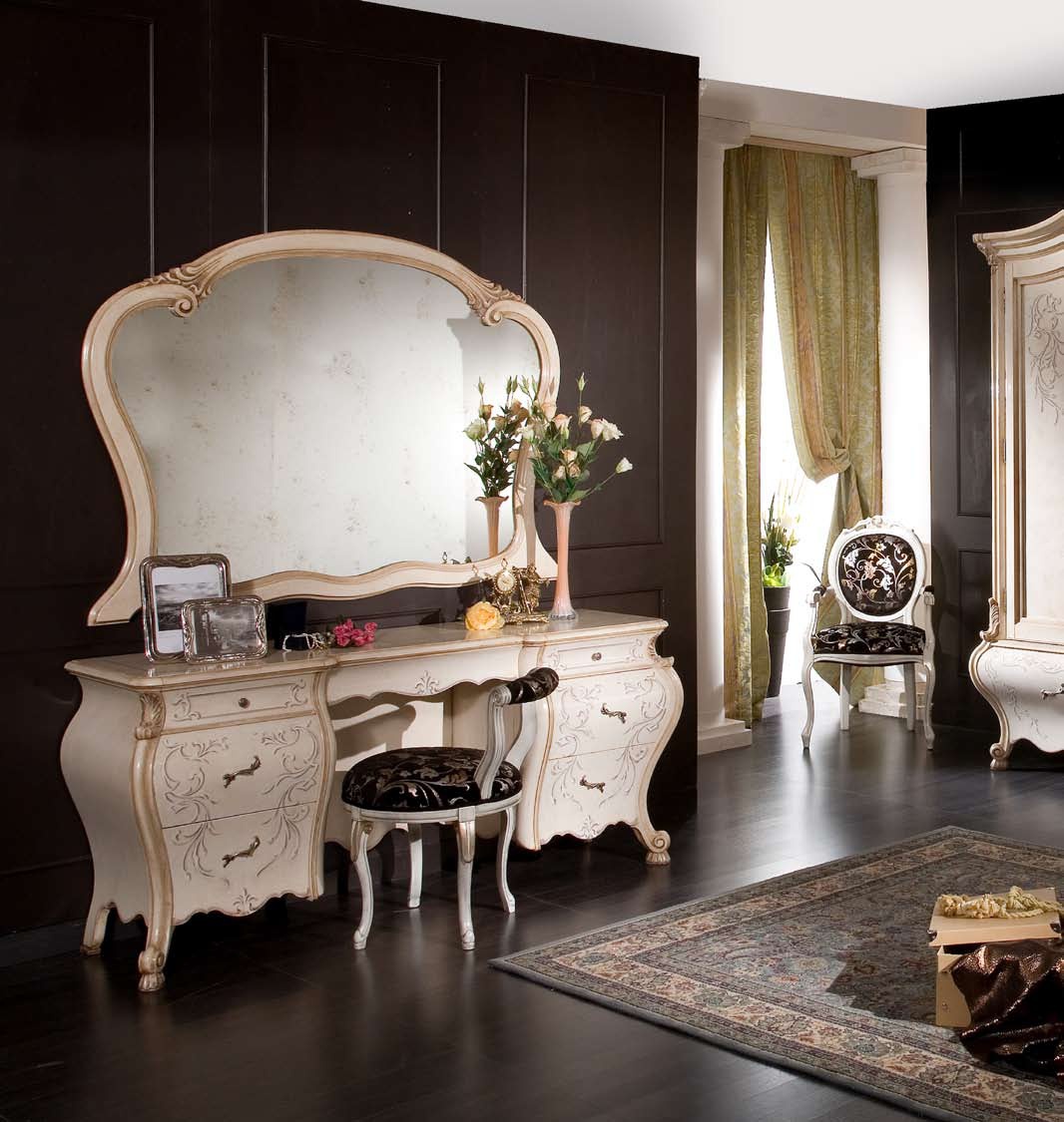 Set for bedroom Persia from the Italian manufacturer Arve Style. The set includes: double bed with high padded headboard in textiles from the range, bedside tables, chest of drawers, wall mirror, dressing table, wardrobe. The solid wood used for frame base, frame. As a finishing varnish shade of ivory, you can choose the colour in the catalog. Set is decorated with elegant carvings, floral designs. The design is classical. Set will fill your bedroom with charm and luxury.