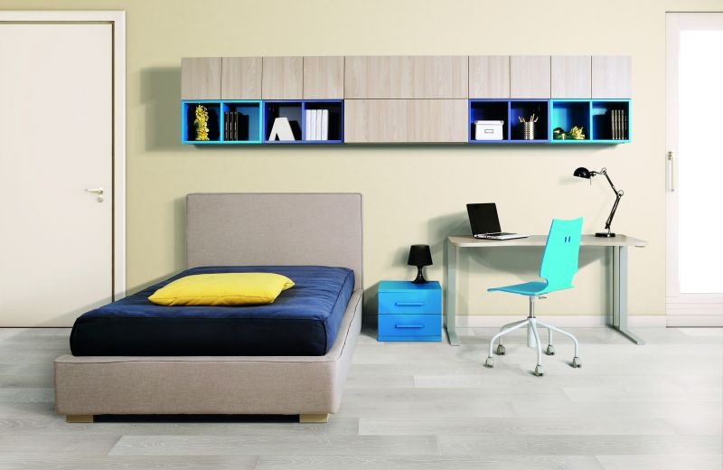 Set for children's Smail T03 from the Italian producer Julia Arredamenti. The model is made in a modern style. Includes single bed, bedside tables and hanging shelves. The body wood. The upholstery is available with a soft cloth. Color catalog of the company.
