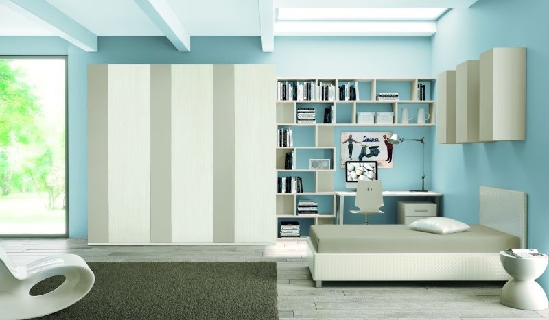 Set for children's Smail T06 from the Italian producer Julia Arredamenti. Includes a single bed, a system of open and closed shelves, a Desk and a wardrobe. Frames models made of wood and metal. The surface is treated with lacquer.