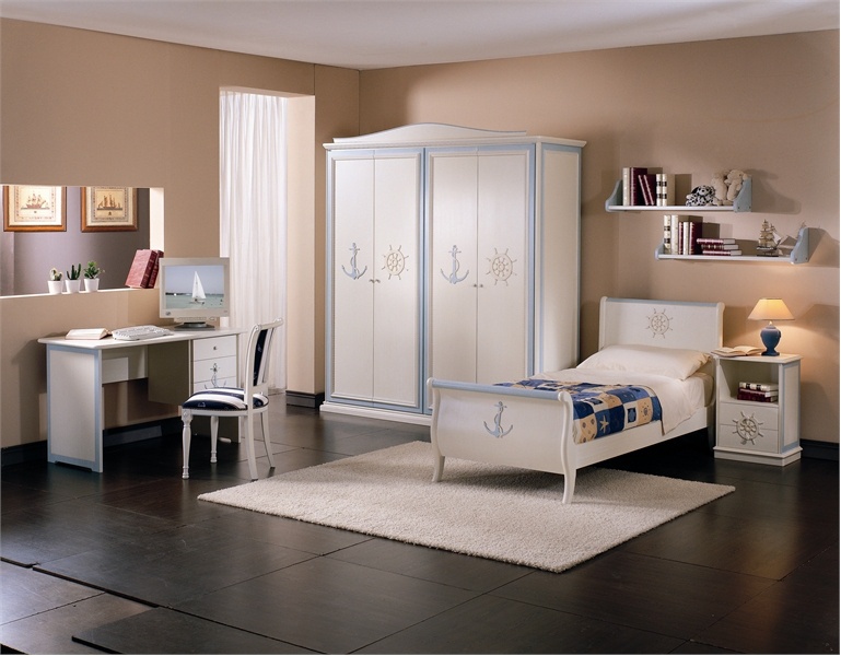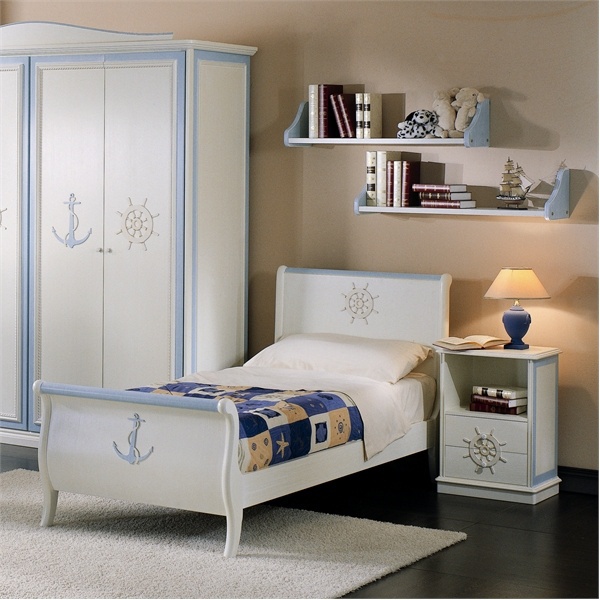 Skypper Letto bed from Italian manufacturer Pellegatta. Headboard and footboard with a slight curl of a wood, ramino, embellished with applications in shape of helm and anchor. Nautical theme supports the execution of all items in the collection. The bed on the frame of tamborito, plate material with honeycomb on the basis of solid spruce. Legs and columns supporting a headboard made in a soft padding with a decorative stitch made of solid wood, ramino, decorated with carvings. Finishing is made by hand coloring in any colors from the range or by a given sample. The model can be decorated with hand painting technique of tempera miniatures used 6-8 colors, image possible from the location of the factory or on the customer's sketch. The surface is covered with a substance, which protects it from scratches and damages. The series also includes a wardrobe, bedside table, Desk, and chair.