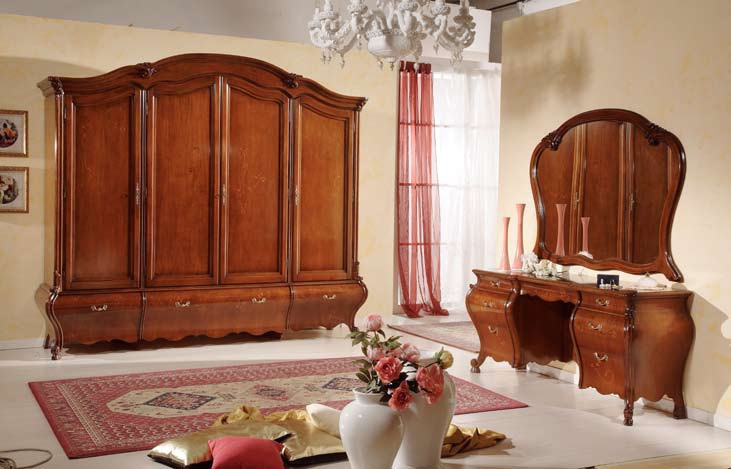 Set for bedroom Persia from the Italian manufacturer Arve Style. The set includes: double bed with high headboard and footboard, bedside tables, chest of drawers, wall mirror, dressing table, wardrobe with 4 doors. Frame, base, frame made from solid wood. As used veneer finishes from the range. Graceful fittings, metal. Set is decorated with delicate carving, inlay. Style classic. Headsets decorate a bedroom interior will bring charm and luxury.
