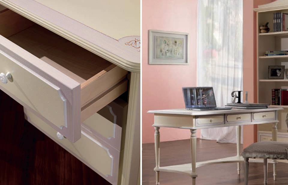 | Description: | Desk from the Italian manufacturer Pellegatta. Model with drawers. Structure made from solid wood. Finish - lacquer color avorio bucciato (n.60) lilla bucciato (n.63), hand painted. Finish on the photo. |