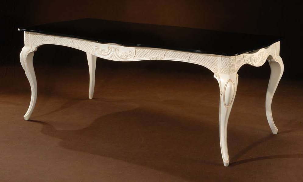 Ester dining table from Italian manufacturer Arve Style. The product with a rectangular top on curved legs. Frame, table top made of solid wood, surface semi-gloss lacquer in combination with contrasting shades of white and black. The table in classic style, decorated with fine carvings. Fill the atmosphere with elegance and charm.