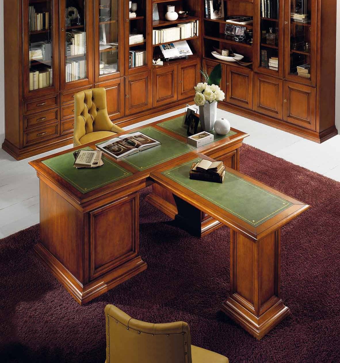 The office (Suite office) from the Italian manufacturer Mirandola Export. Frame products made of wood. Set consists of a roomy modular corner bookcase, a writing table with a leather cover and a side table and swivel chair with leather upholstery. Beautiful set will make Your office a great place to work.