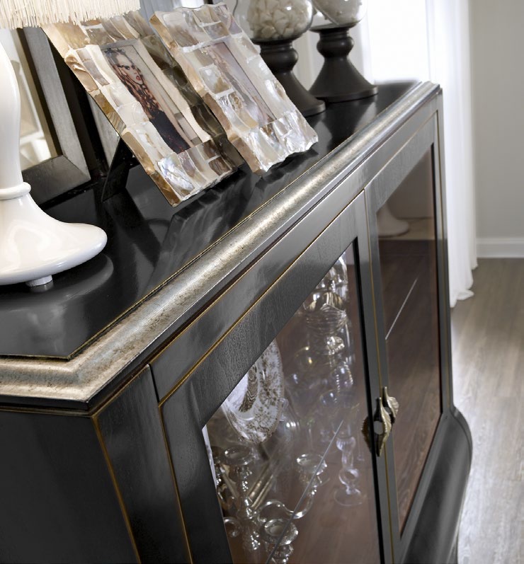 Sideboard New Romantic from the Italian manufacturer Arve Style. The product on figured legs, fitted with 2 doors and shelves glass. The base frame is made of solid wood. Finish - lacquer in black color, you can choose colors from a catalog. The model is decorated with silver patina finish, with exquisite fittings. Refined product will fill the interior with sophistication.