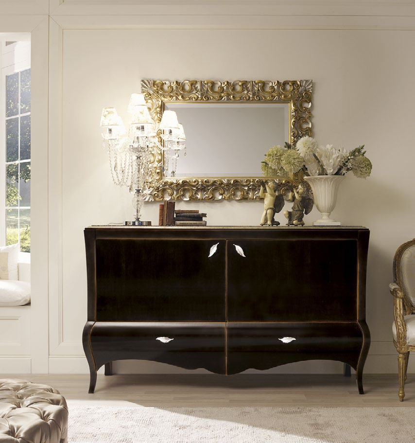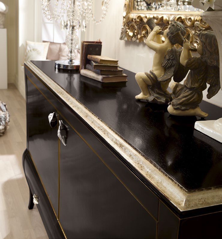 Dining room set for a New Romantic from the Italian manufacturer Arve Style. This set includes: shelving for TV, utensils, dining table with square top made of glass, sideboard. The base, the frame is made of solid wood. Finish - lacquer shades of ivory, black, you can choose colors from a catalog. Sophisticated shapes and contrasting combination of colors makes this set bright, sophisticated.