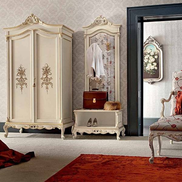 Entrance hall (set for the hall) from Casanova Italian manufacturer Modenese Gastone. The kit includes: wardrobe, Stand for Luggage, Wall panel. Frame, body - solid wood, hand carved. Finish - lacquered. The model is made in the Rococo style. Colours in stock.