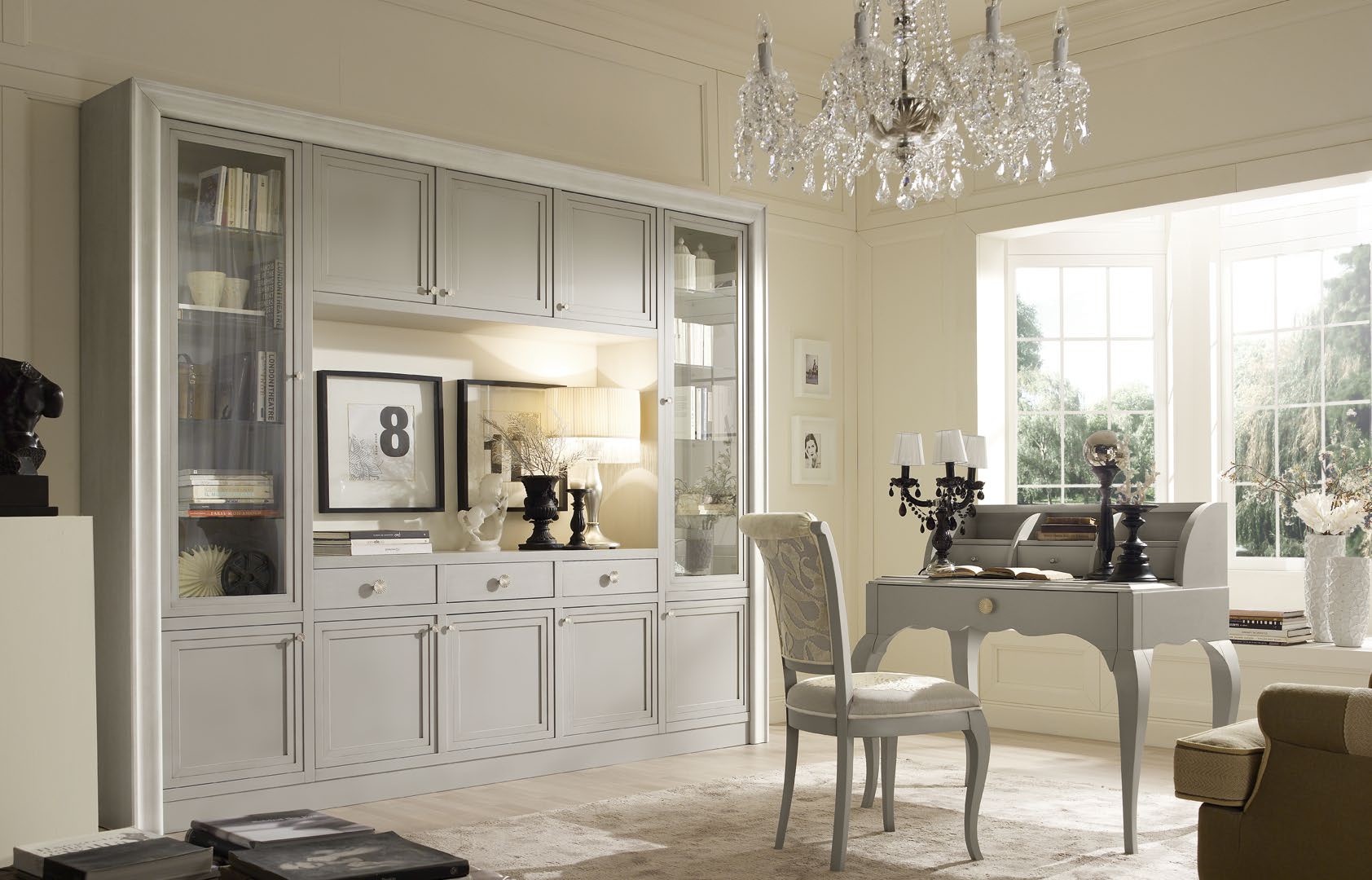 Rack New Romantic from the Italian manufacturer Arve Style. The product on a massive basis, equipped with niches behind blind doors and glass drawers. Finish - grey lacquer available choice of colour in the catalog. Accessories metal. The neoclassical design makes this rack perfect for classic and modern interior of the Cabinet, the living room. The bookcase will perfectly complement a Desk from the same collection.