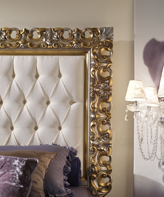 Bed New Romantic from the Italian manufacturer Arve Style. The product with high headboard in a soft upholstery textiles. The headboard is decorated with stitch - Capito, hand carved in gold leaf and silver. Frame, base made from solid wood. Finish - the varnish according to the manufacturer. Bed in classic style. Luxury elegant design will fill the interior with grandeur.