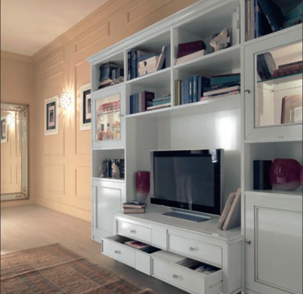 Modular system for TV Salieri from the Italian manufacturer Arve Style. The module consists of cabinets with shelves as a bridge, as well as cabinets for TV with 4 drawers. The frame, the frame is made of solid wood, veneer catalog. Finish - white lacquer. Accessories metal. The module is equipped with built-in lighting. Style classic, the perfect complement for a sophisticated living room