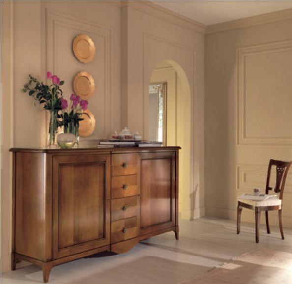 Set for the dining room Salieri from the Italian manufacturer Arve Style. Set consists of extendable dining table with square/rectangular table top, chairs in upholstery textiles, showcase with glass doors and shelves, sideboard 2 doors and 4 drawers. Frame, base, the table top is made of solid wood. Finishing - veneer out of range. Accessories metal. The design is classical. Excellent choice for creating a luxurious atmosphere.