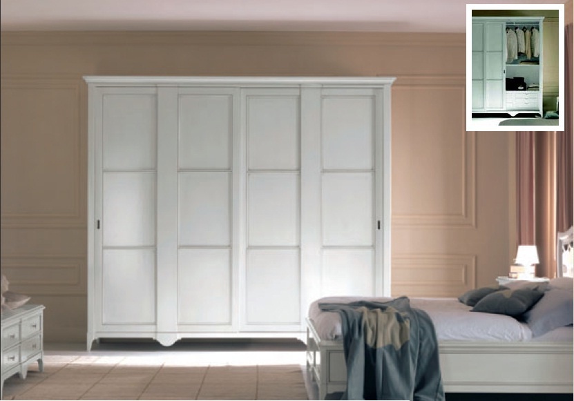 Set for bedroom Salieri from the Italian manufacturer Arve Style. This set includes: double bed with high headboard with carved decoration, bedside tables and a dresser with the same design, wardrobe with sliding doors and small drawers, built-in wardrobe. Frame, base made of solid wood. The finish is white lacquer, it is possible to choose from a catalog. The design is classical. The perfect choice for a cosy atmosphere in stylish bedroom.