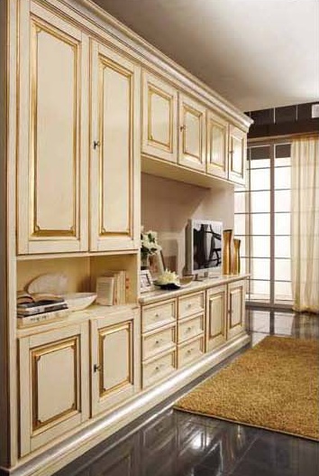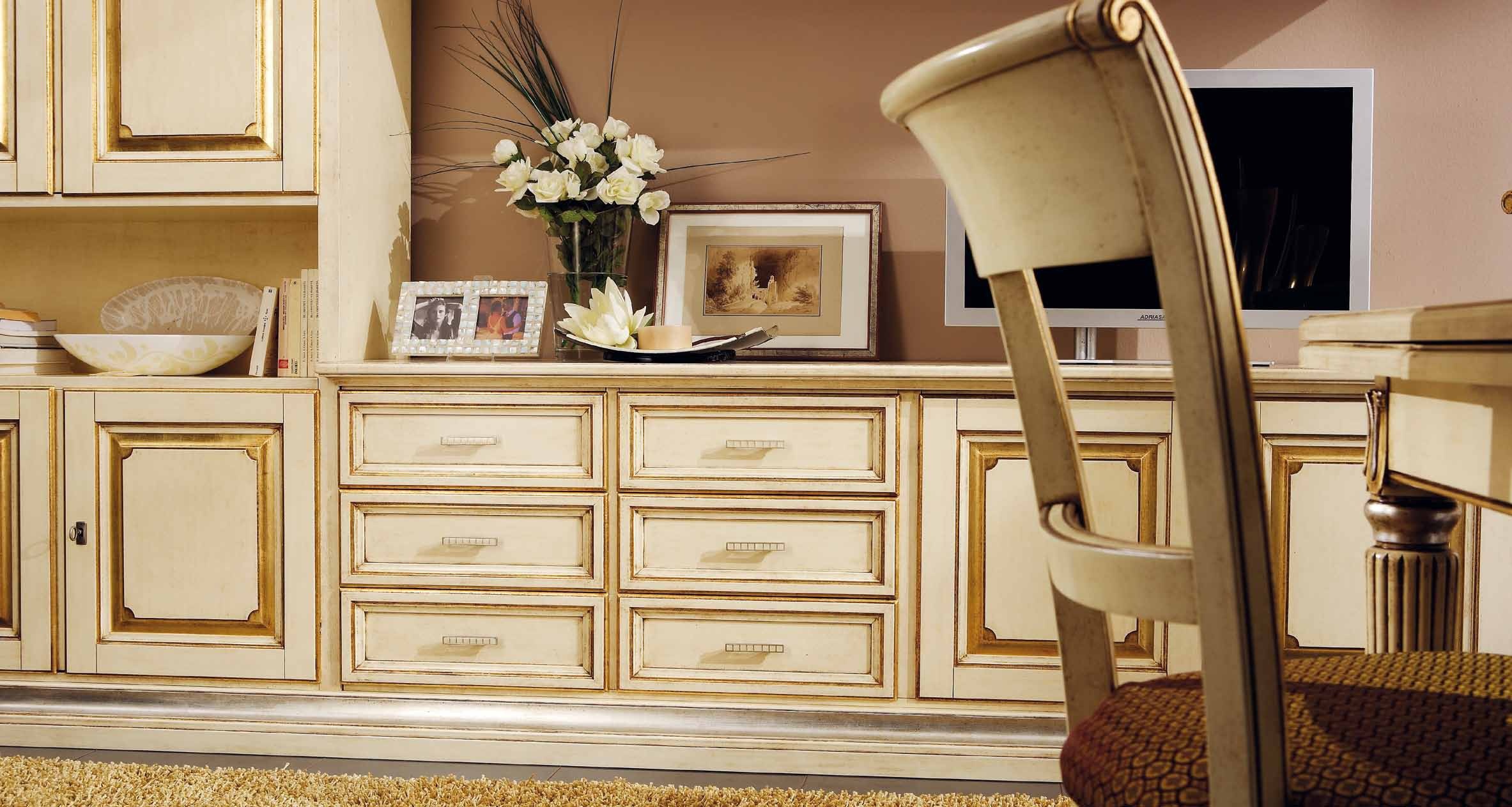 Modular system from Italian manufacturer Mirandola Export. The model is made in classic style. The frame is made of wood. The modular system consists of drawers, an open compartment, drawers and space for TV. Roomy modular system Mirandola Export decorative carved pattern with the gold trim will be the Central element of the interior.