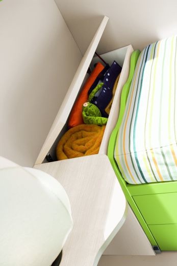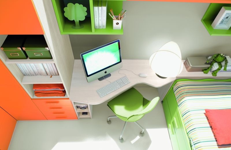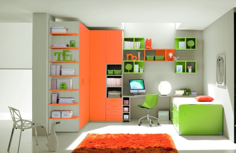 Set for children's Smail T18 from the Italian producer Julia Arredamenti. Consists of a corner Cabinet, a single bed, a writing Desk and chair on wheels. Frames made of wood. The surface is treated with lacquer. Color - green and orange.