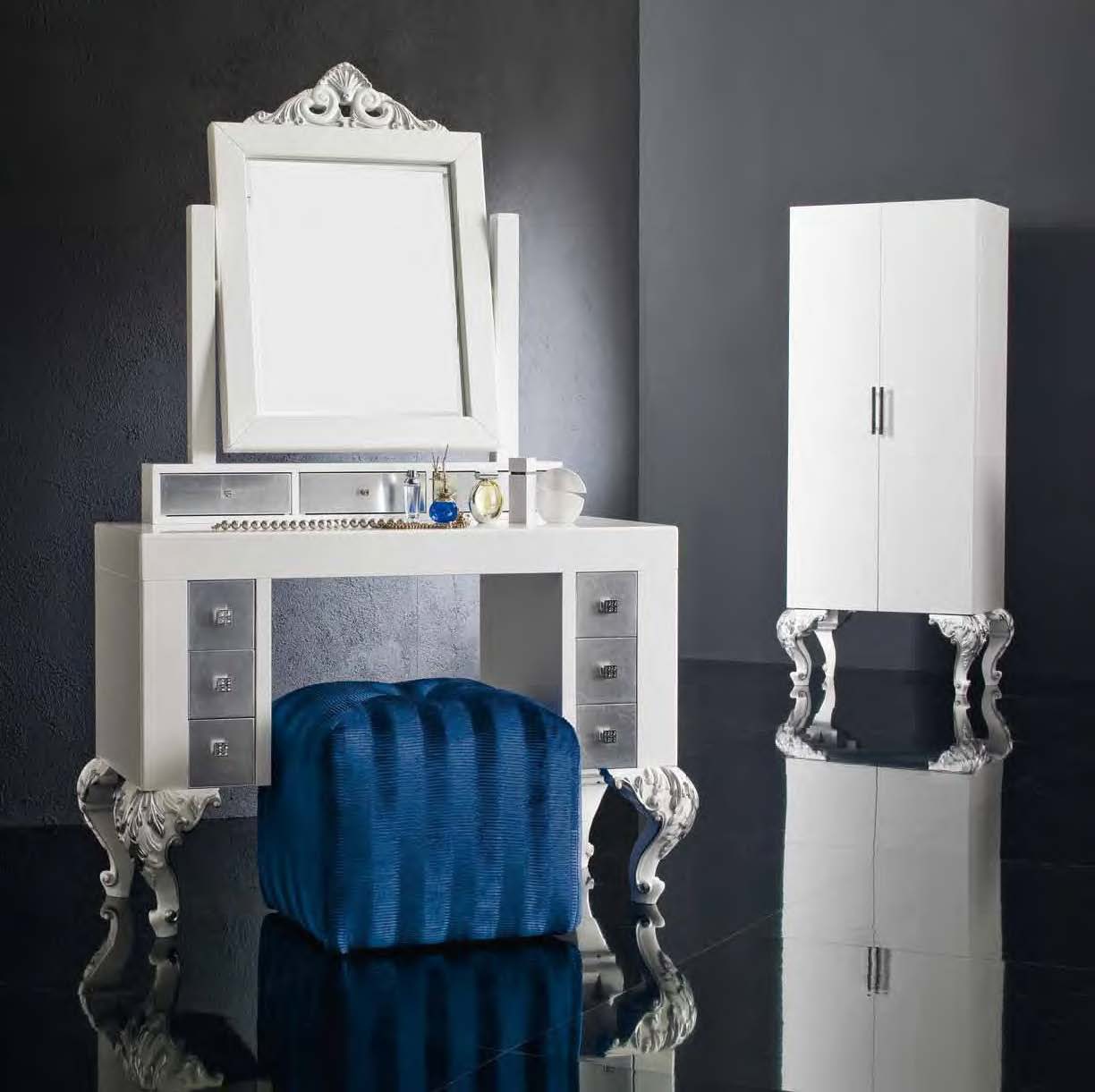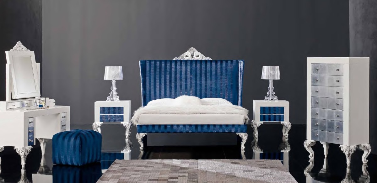 Bedroom (Suite bedroom) Minimal Baroque from the Italian manufacturer Modenese Gastone. The set includes: double bed, bedside tables, chest of drawers, dressing table, stool and wardrobe. Frame, the case is solid wood. Decorative elements thread of manual work. Finish - lacquered. Upholstery - textiles. Handles - metal. The model is made in fusion style. Colours in stock.