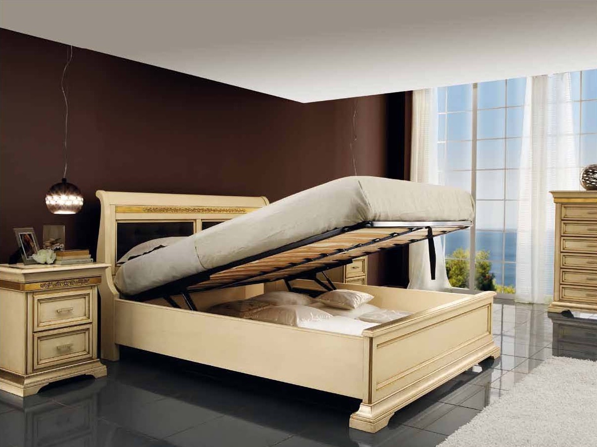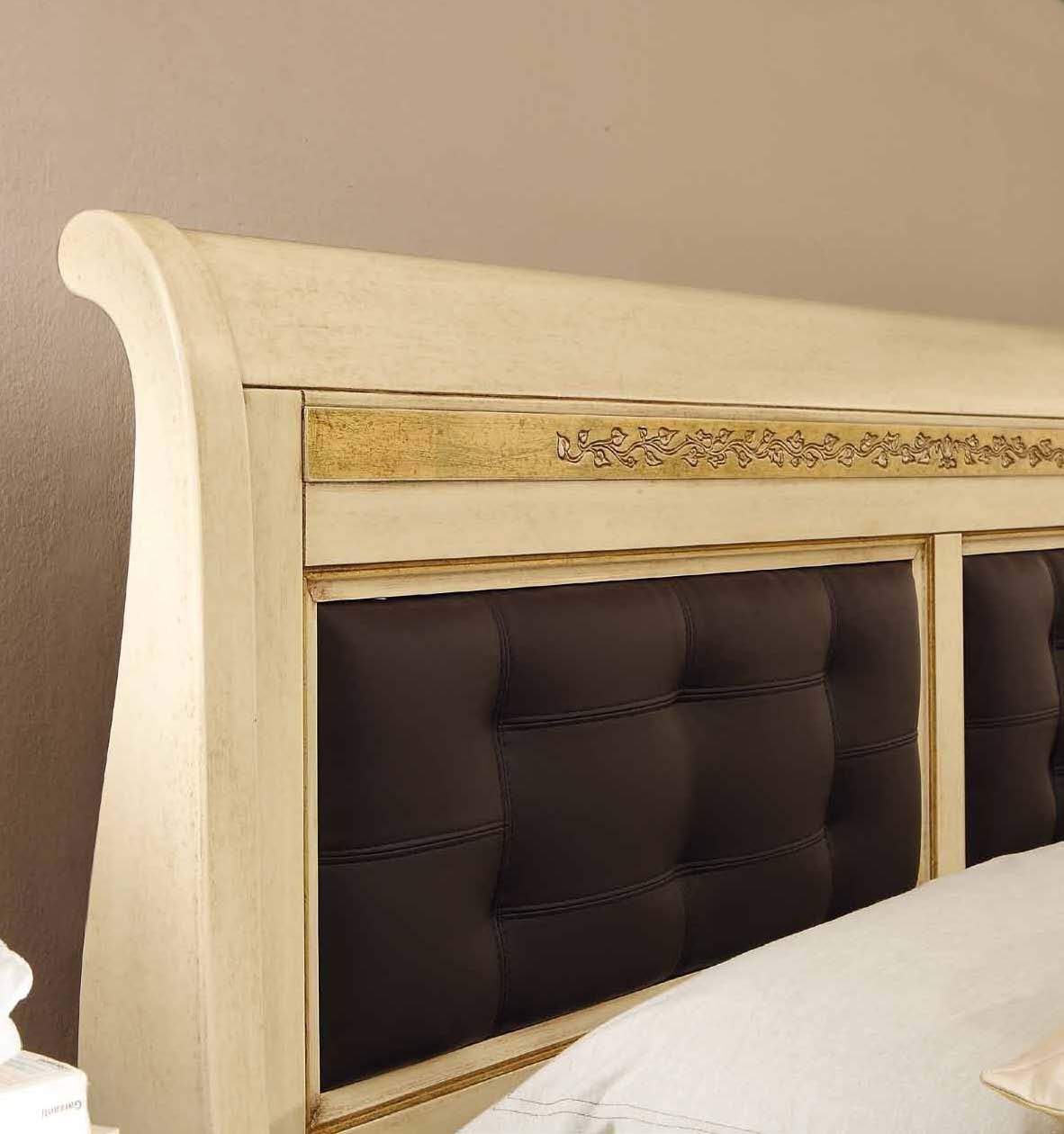 Bedroom (Suite bedroom) from the Italian manufacturer Mirandola Export. Beautiful set consists of a double bed with high upholstered headboard and drawer, bedside tables with three drawers and chest of drawers with six drawers. The classic set is decorated with carved pattern with gold trim. The best choice for Your bedroom.